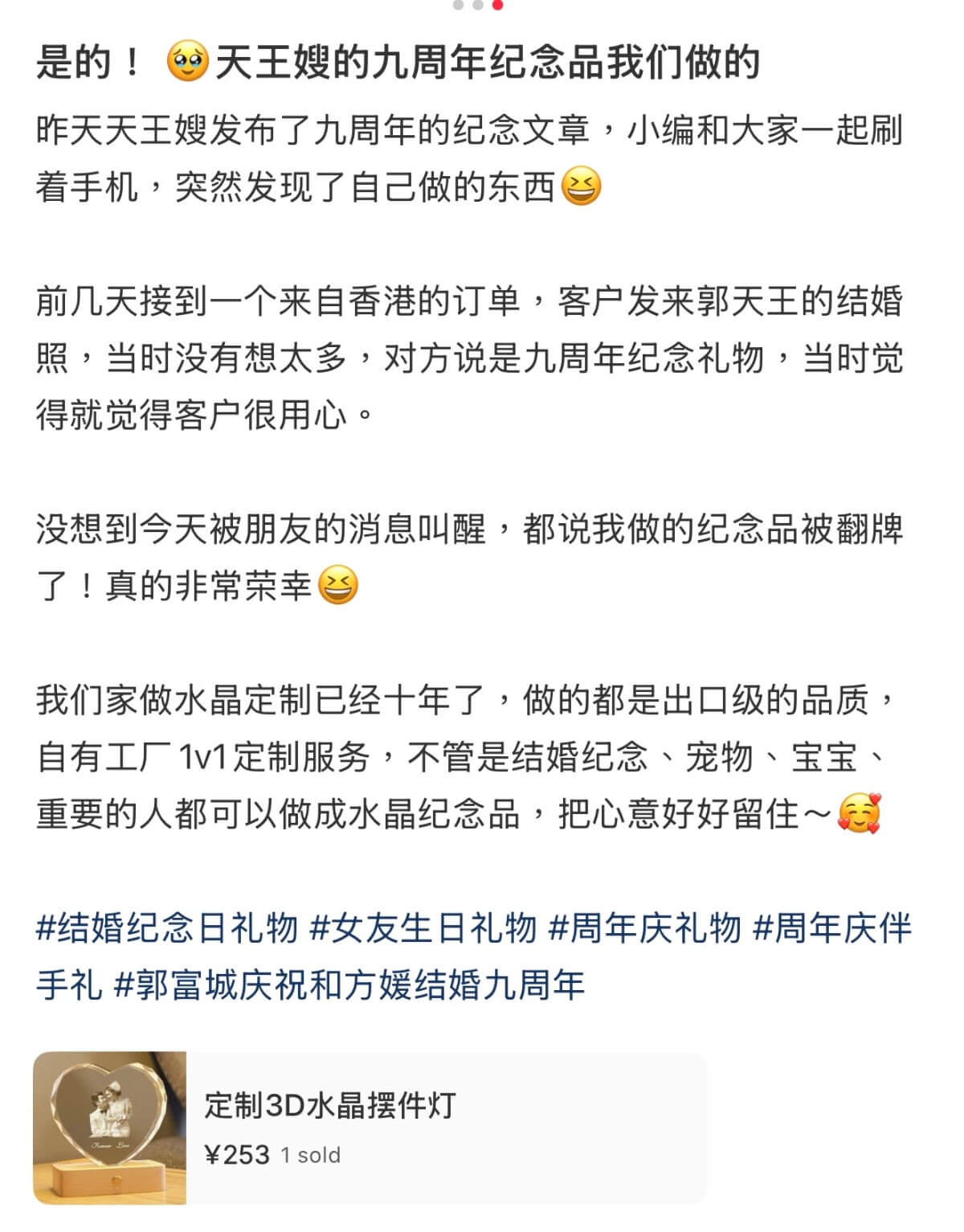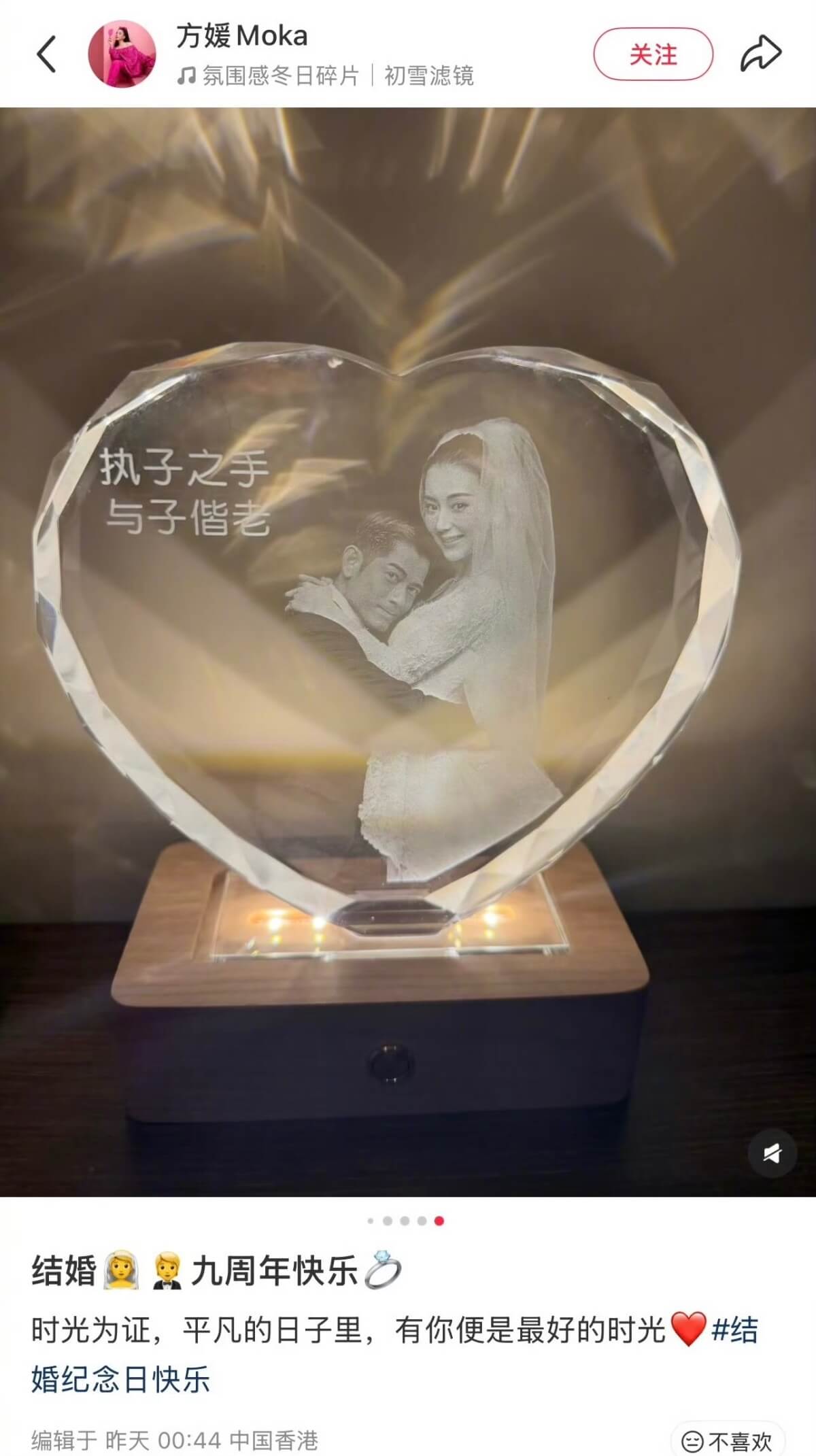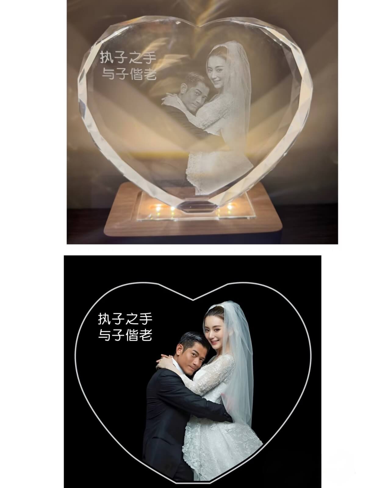 沒想到其中一張照片引起了網友關注,那就是刻有兩人婚紗照的水晶雕刻擺設👇