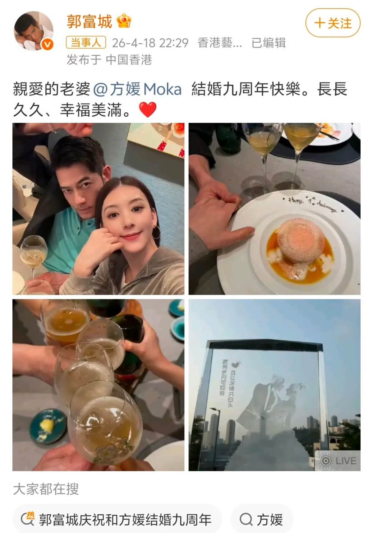 而日前兩人慶祝結婚9週年,先是郭富城發文放閃👇