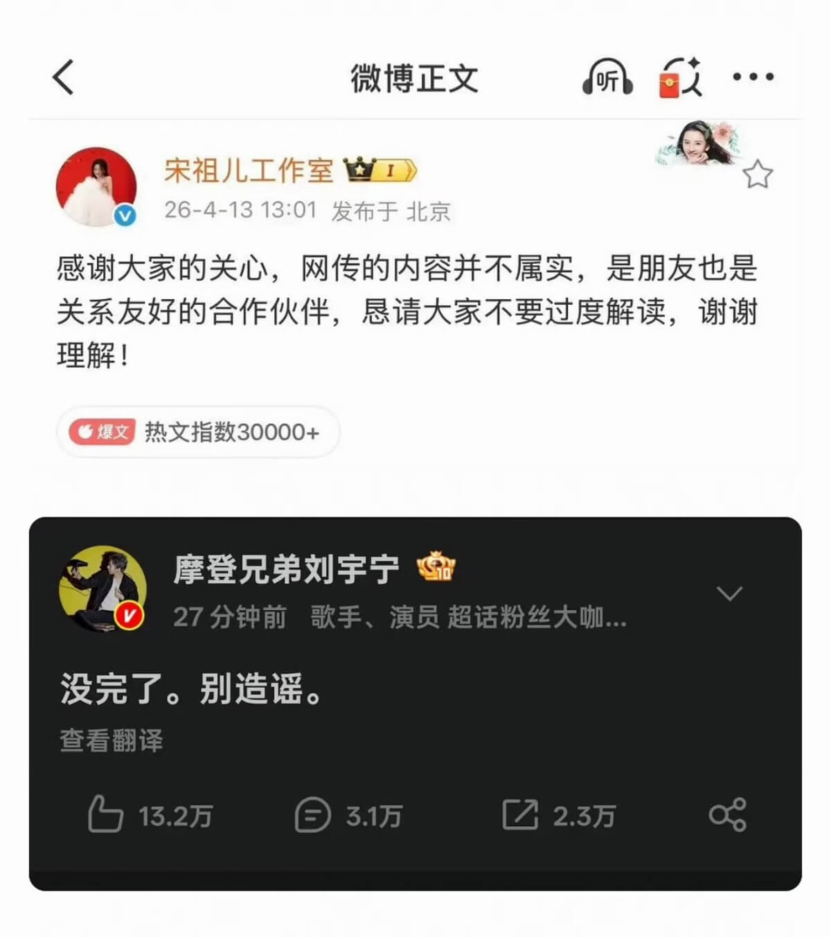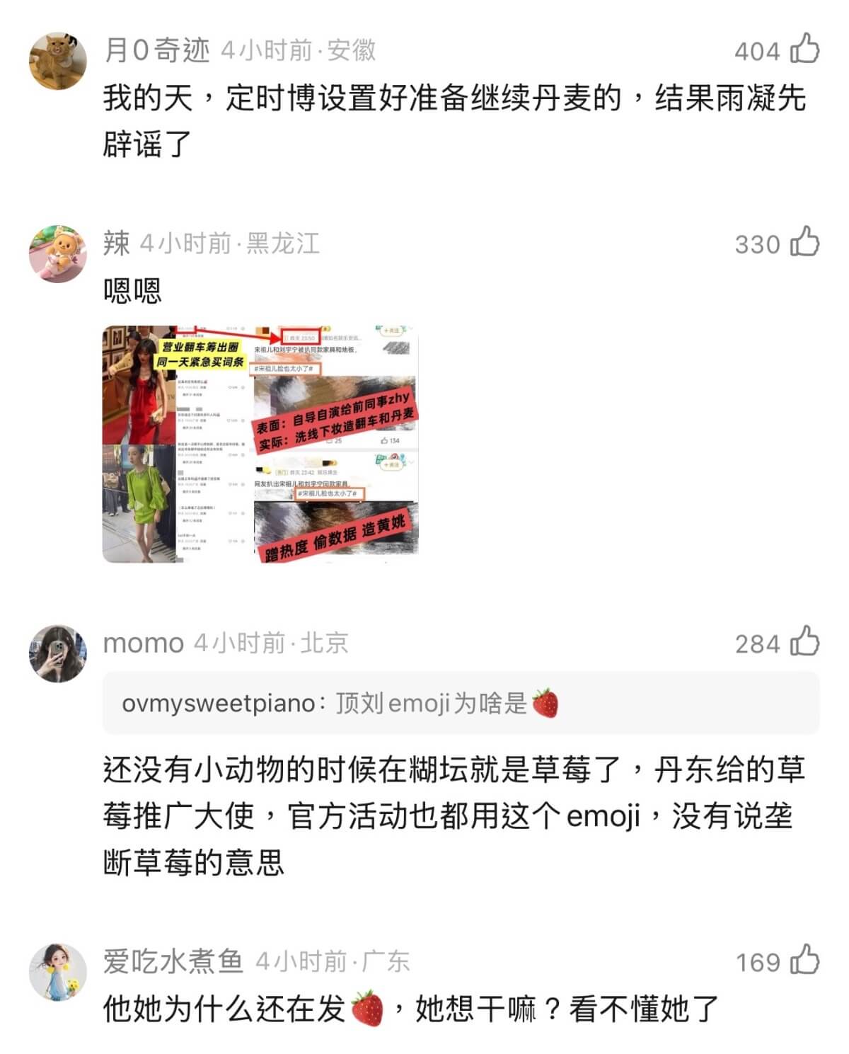 而宋祖兒偏偏在這麼敏感的時期,選擇用了這個草莓符號,被指就是在硬剛劉宇寧!也有網友推測這是則排期帖文,如果劉宇寧沒有發闢謠聲明的話,這個「🍓」就變成了CP粉的糖點了,來看網友熱評👇