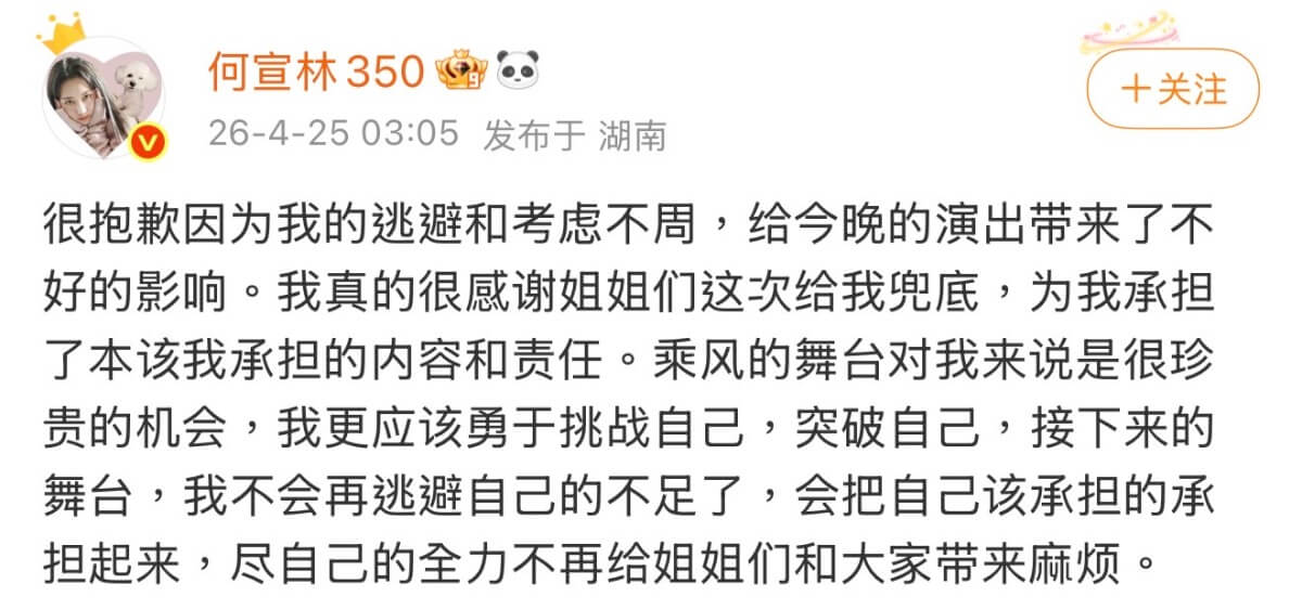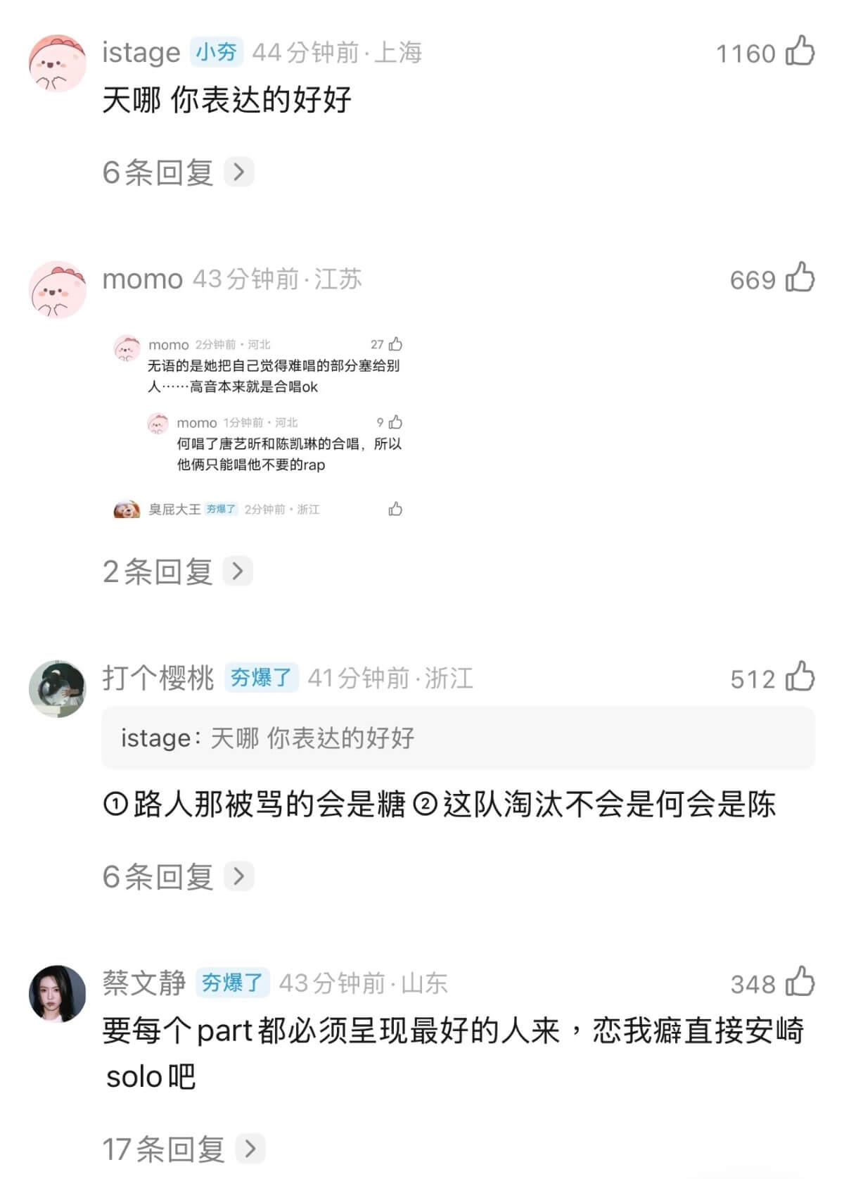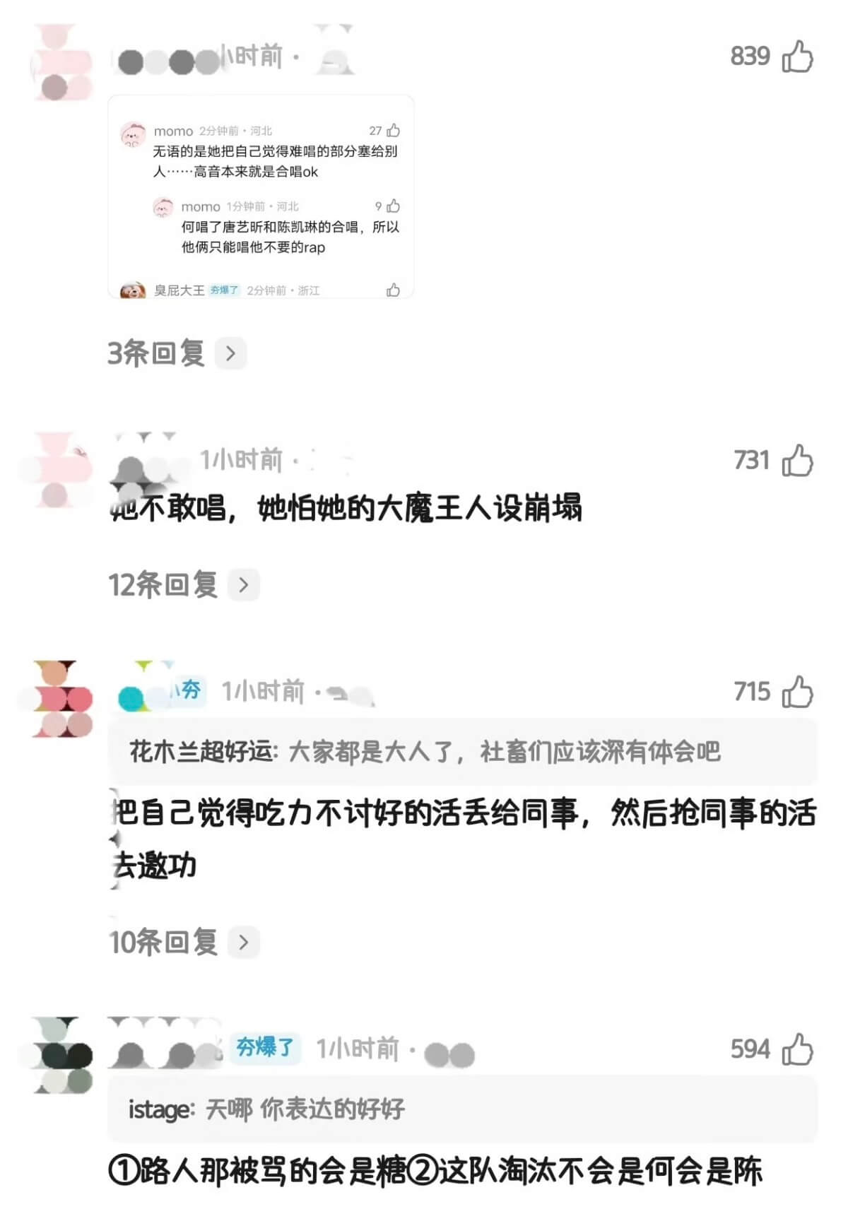 而直播中,唐藝昕也現場回應:「能力有限,本來這兩句歌詞不是給我的,但是我們本來就是一個組的,分擔一下沒什麼。不過我覺得這句歌詞就是罵人的。」