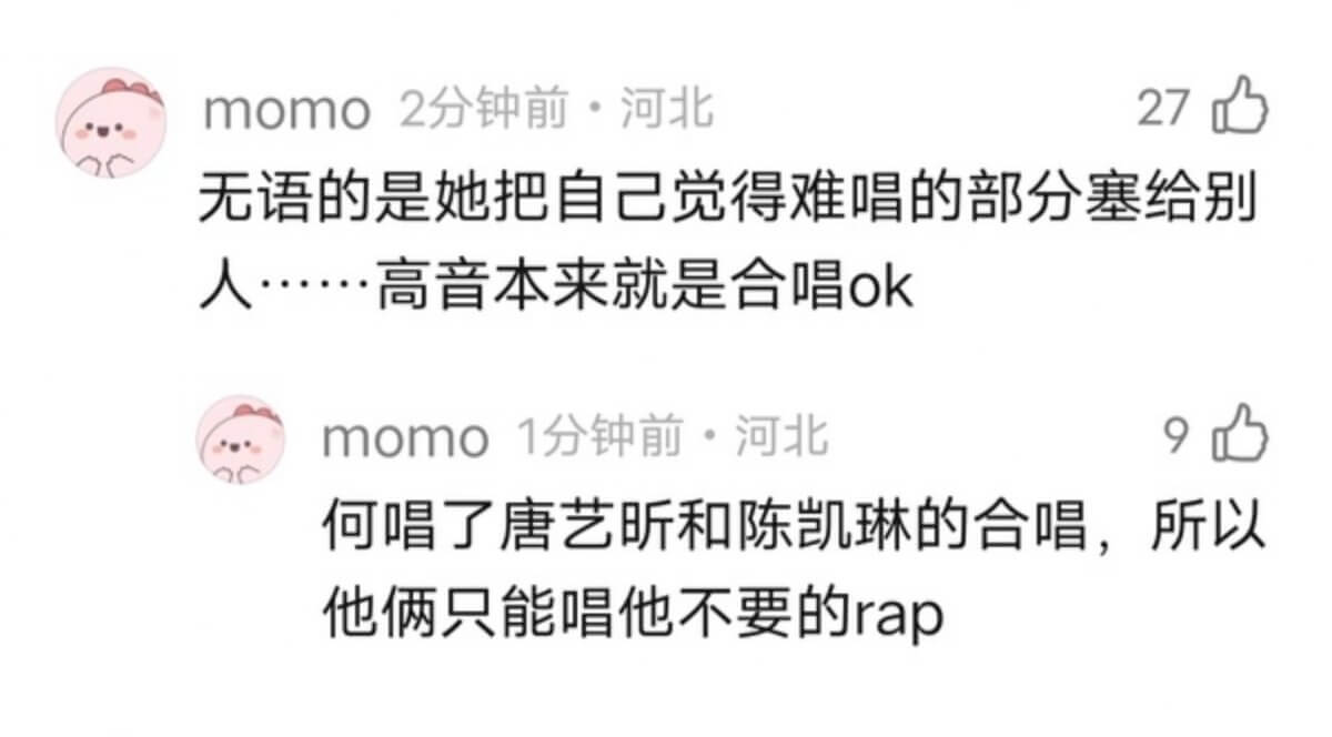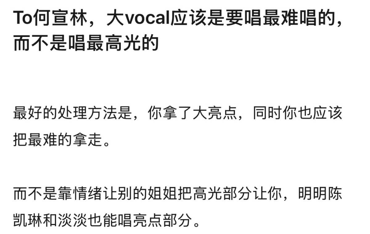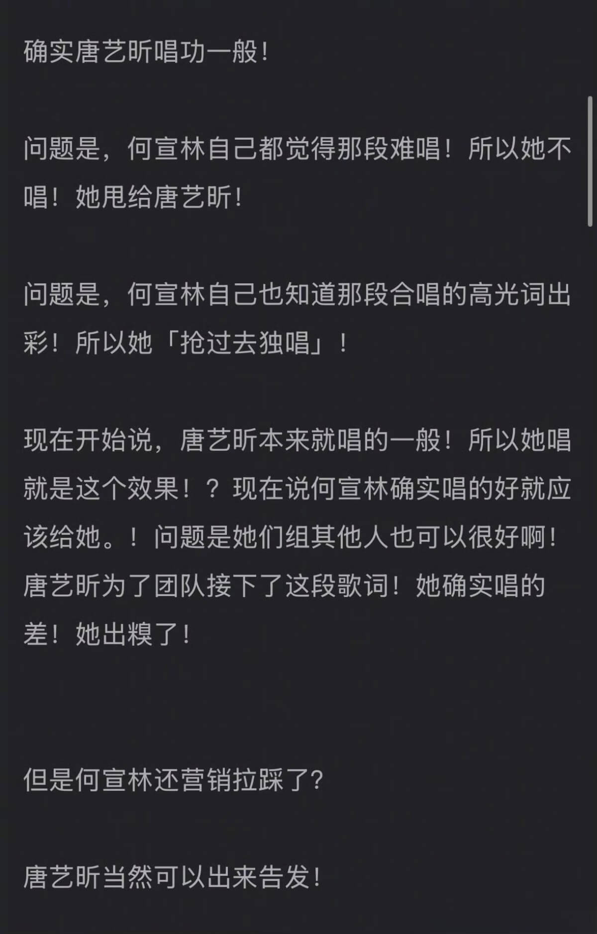 但網友也發現了重點,那就是被視為最難唱的這一部分,原本是由隊內唱功公認好的何宣林負責,但由於她唱不好,所以就換給了唱功「有目共睹」的唐藝昕👇