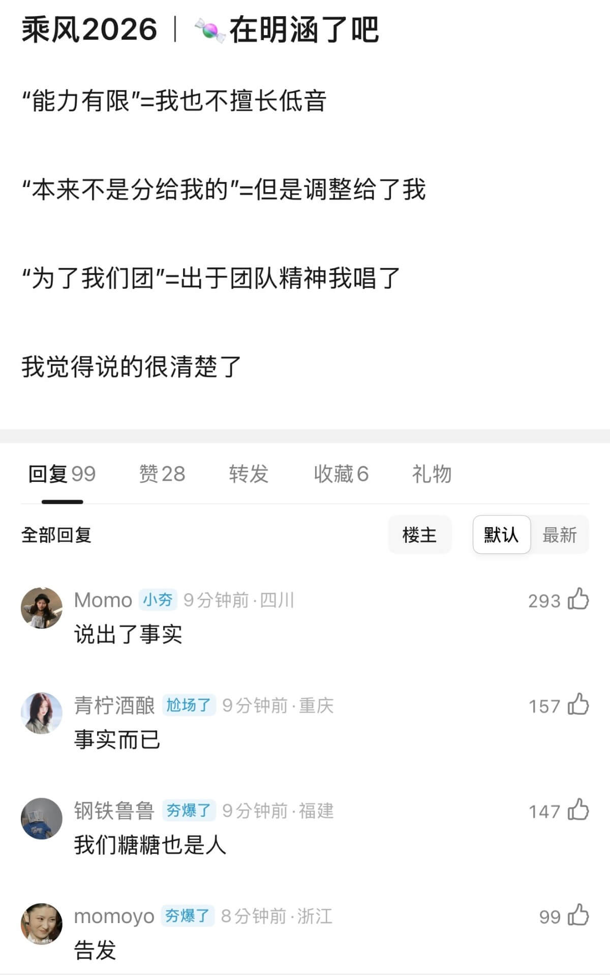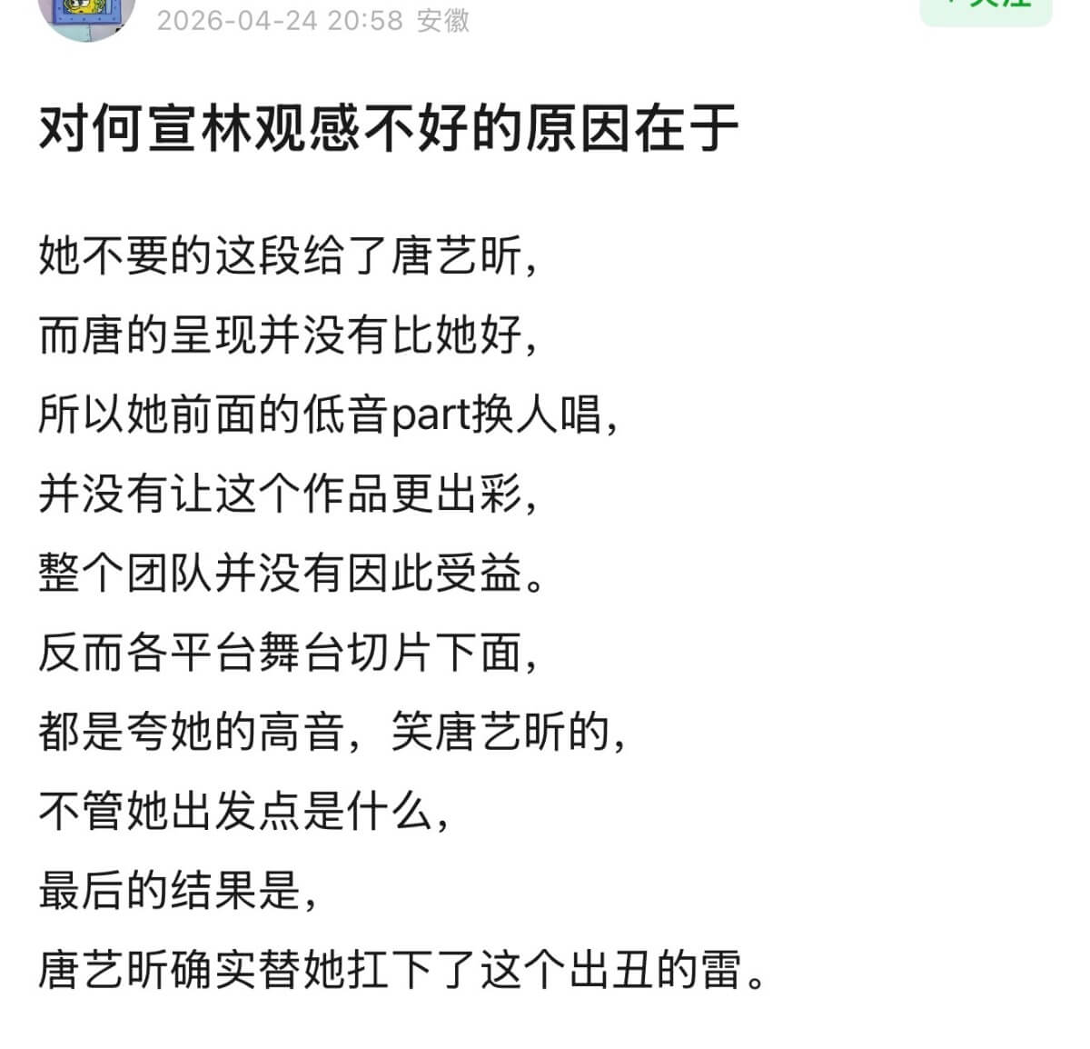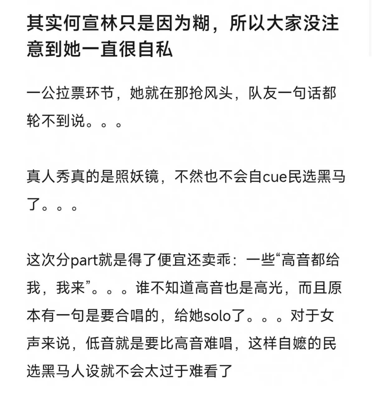 但網友也發現了重點,那就是被視為最難唱的這一部分,原本是由隊內唱功公認好的何宣林負責,但由於她唱不好,所以就換給了唱功「有目共睹」的唐藝昕👇