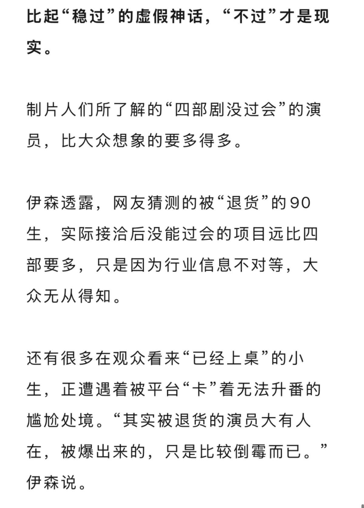 訪問中也提及有平台明確拒絕的藝人,至於網傳連續4部電視劇不過關的90生,其實不屬於小眾,甚至可以說多不勝數!
