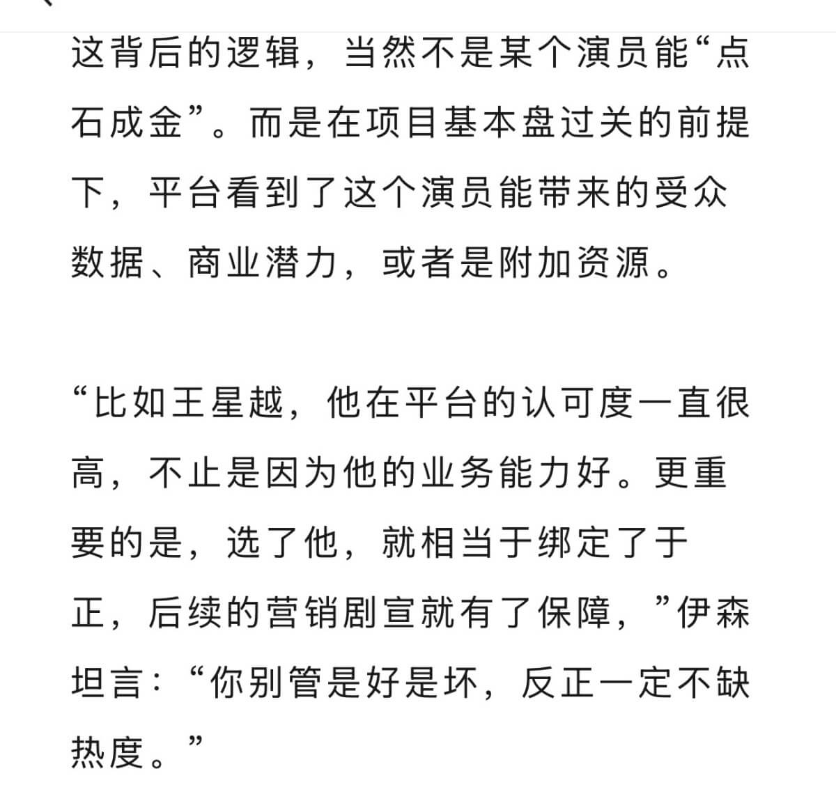 該業內也提及過關的前提,是因為平台看到了這個演員能帶來的受眾數據、商業潛力,或者附加資源。這裡以王星越為例子,提到了他被選擇的原因之一,是因為綁定了于正,後續的營銷劇宣就有了保障。