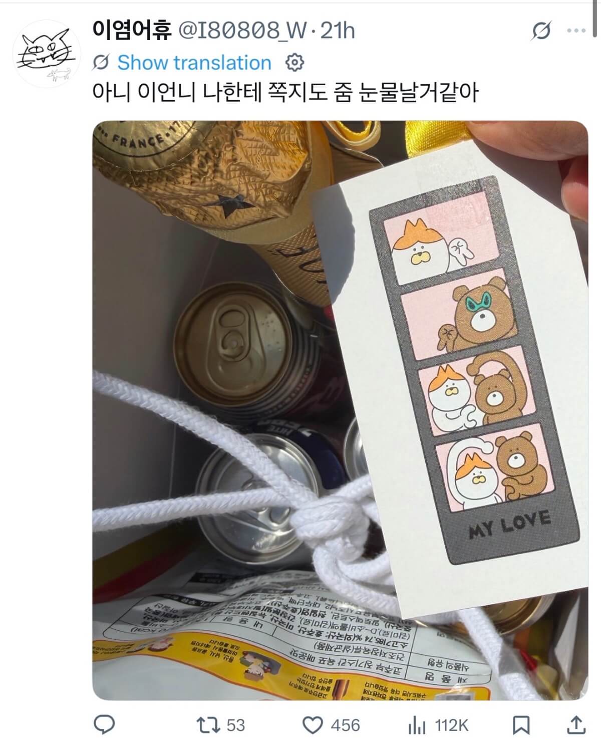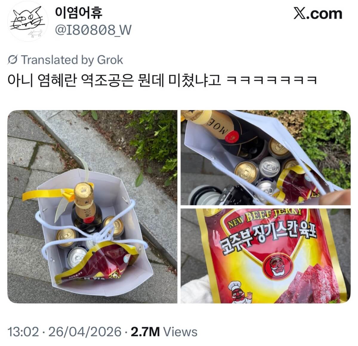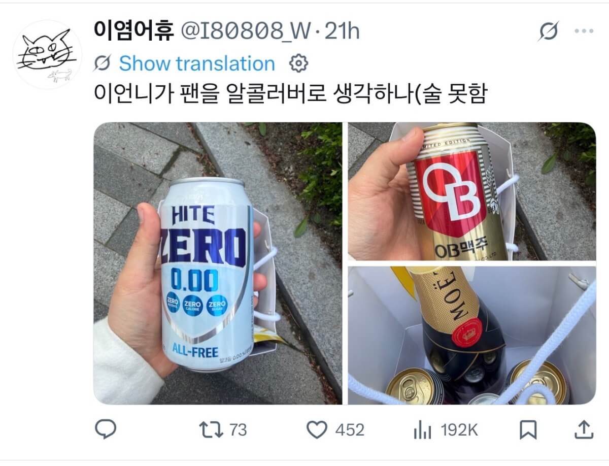 到底送了什麼呢?打開一看,哈哈哈哈哈~這麼氣勢洶洶送上的,是各種不同類型的酒,還有…下酒菜!難怪原Po表示:「不是,廉惠蘭這逆應援到底是怎麼回事,瘋了嗎?」