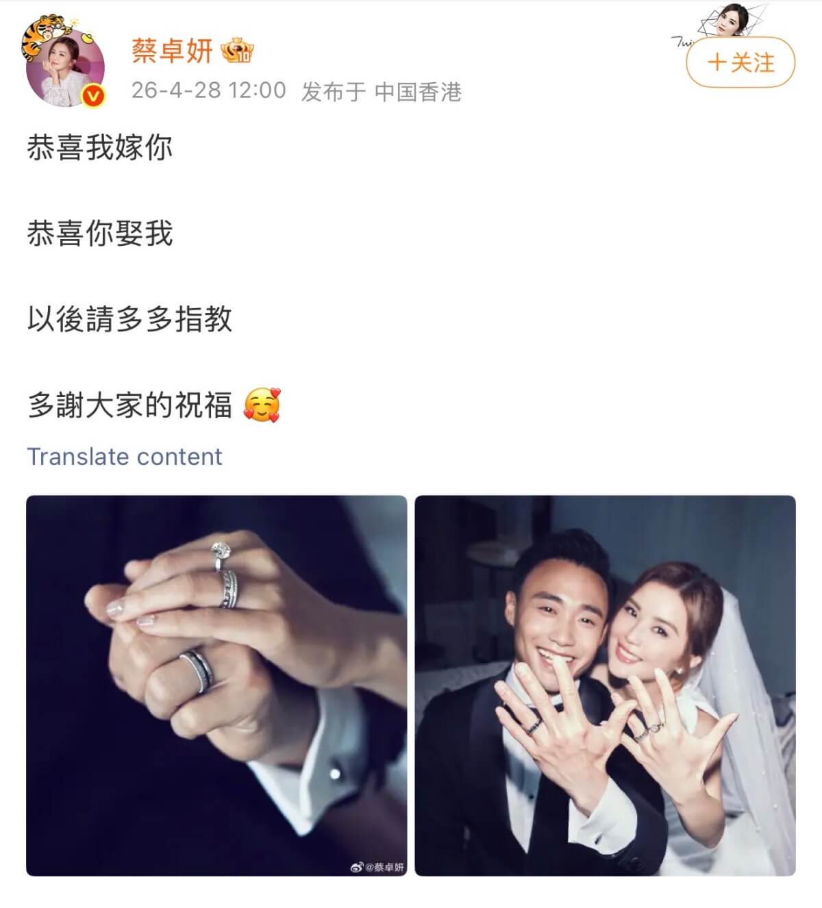 大寫的恭喜!和小10歲教練戀愛!蔡卓妍24字幸福宣言官宣結婚啦!!!