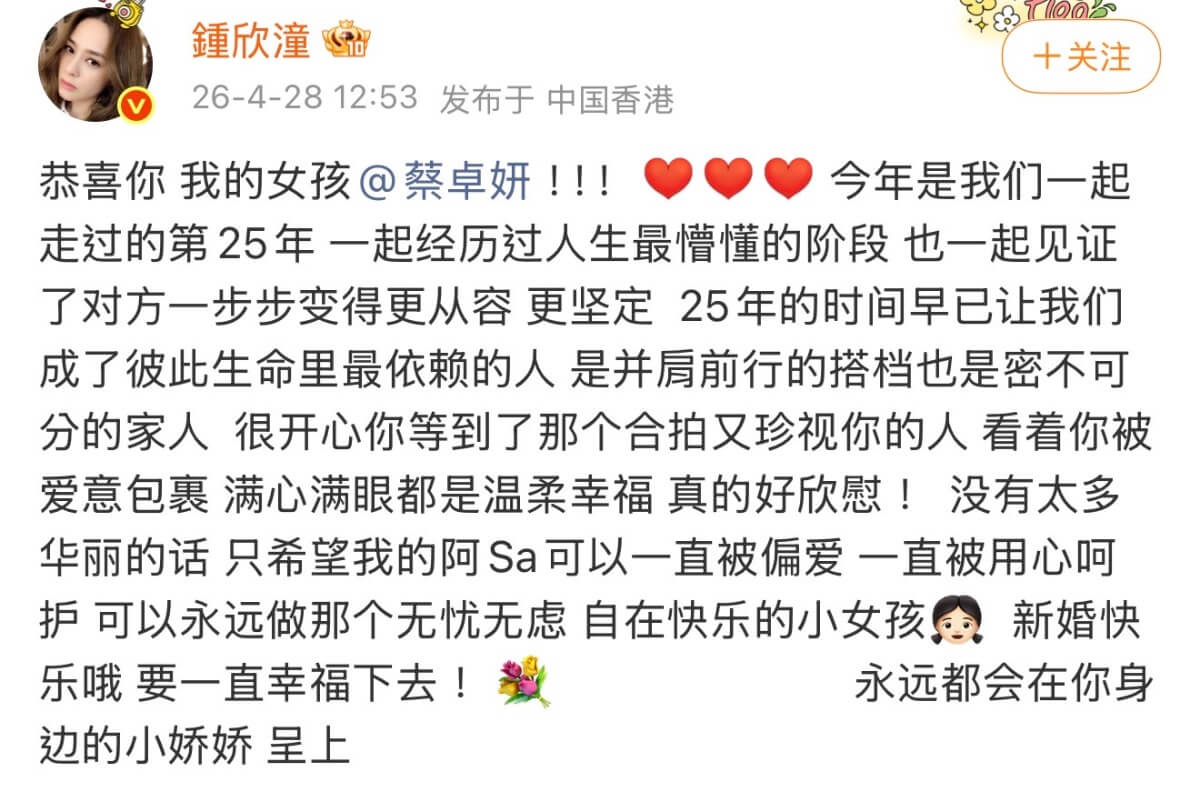 眾星祝福蔡卓妍結婚!鐘欣潼發長文祝福「我的女孩」公開唯一希望!