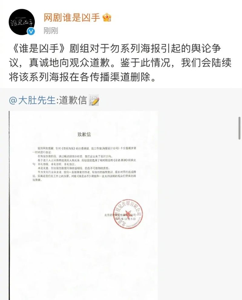 而《誰是兇手》劇組則轉發,表示會將該系列海報刪除。