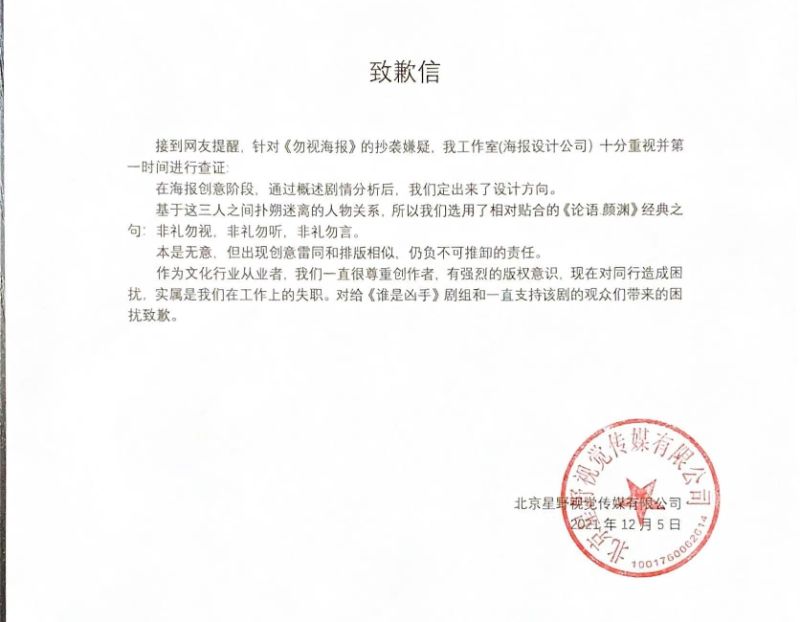 由於抄襲爭議上了熱搜,在劇集開播前一個小時,負責海報設計的設計師工作室發文道歉,表示是選用了《論語顏淵》經典之句:「非禮勿視、非禮勿聽、非禮勿言」為設計概念,本是無意,但出現創意雷同和排版相似,仍負不可推卸的責任。
