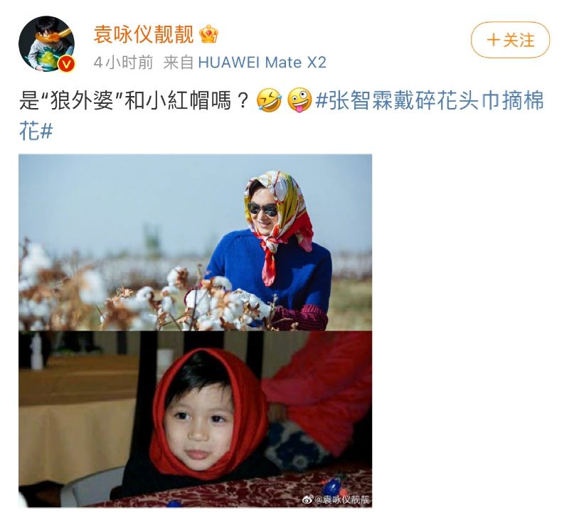 而靚靚隨後也在微博更新,貼出了張智霖和魔童的照片,反問:「是“狼外婆”和小紅帽嗎?」