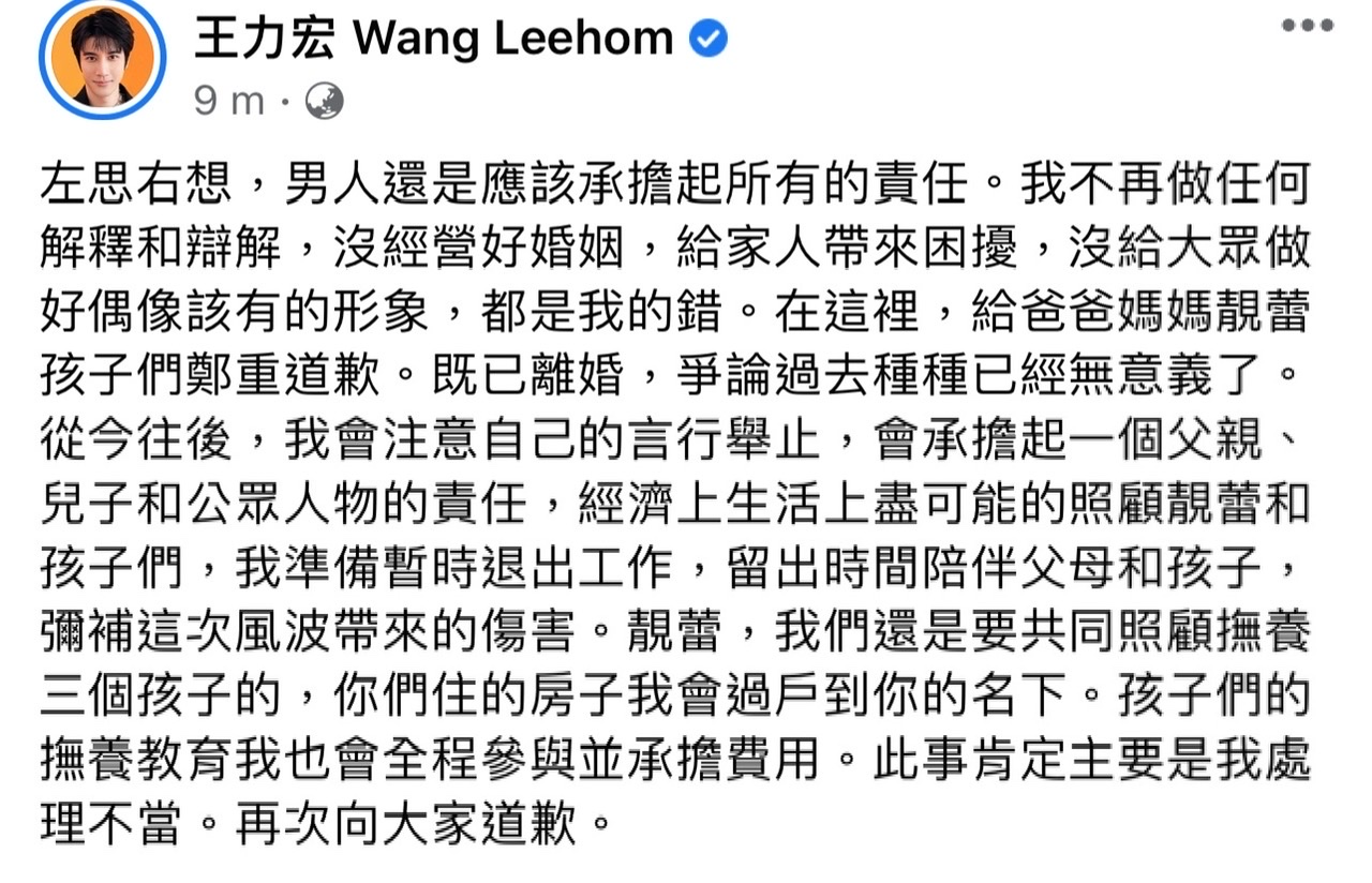 「左思右想,男人還是應該承擔起所有的責任。 我不再做任何解釋和辯解,沒經營好婚姻,給家人帶來困擾,沒給大眾做好偶像該有的形象,都是我的錯。 在這裡,給爸爸媽媽靚蕾孩子們鄭重道歉。 既已離婚,爭論過去種種已經無意義了。 從今往後,我會注意自己的言行舉止,會承擔起一個父親、兒子和公眾人物的責任,經濟上生活上盡可能的照顧靚蕾和孩子們,我準備暫時退出工作,留出時間陪伴父母和孩子,彌補這次風波帶來的傷害。 靚蕾,我們還是要共同照顧撫養三個孩子的,你們住的房子我會過戶到你的名下。 孩子們的撫養教育我也會全程參與並承擔費用。 此事肯定主要是我處理不當。 再次向大家道歉。」