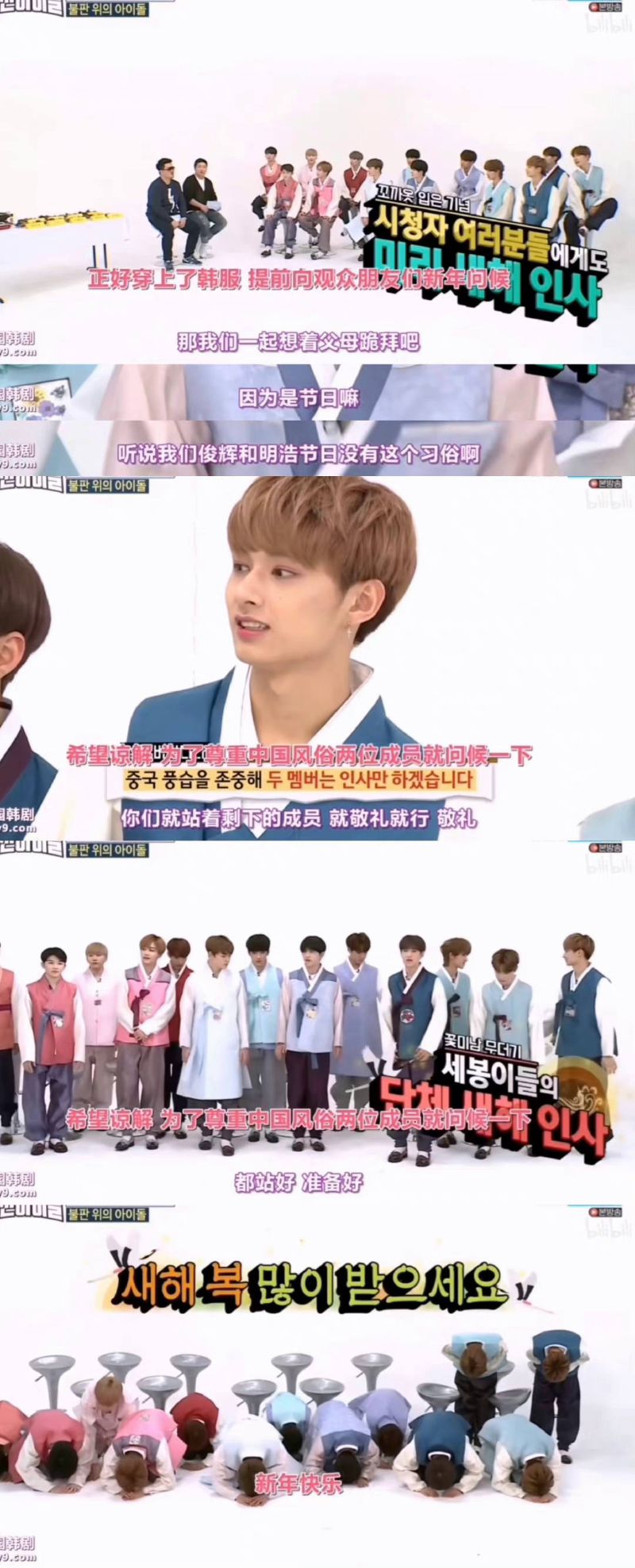 提到這個,不得不點讚小17,SEVENTEEN成員國籍很多,但從來沒有因國籍和文化問題引出什麼爭議,因為都會尊重各自的文化。上節目前會提早溝通,讓中國籍成員不需要跪下行大禮👇