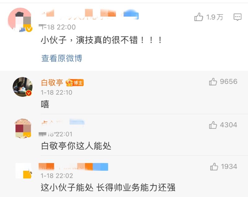 也有網友留言稱讚白敬亭演技不錯,被小白回復:「嘻」,結果這樓下就變成敬亭誇誇樓,都在花式誇小白👇