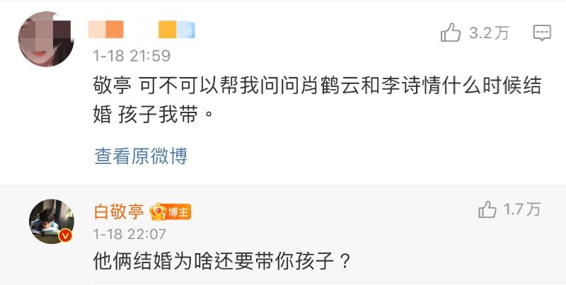 熱評第一的網友問:「敬亭,可不可以幫我問問肖鶴雲和李詩情什麼時候結婚,孩子我帶。」被正主翻牌回復:「他倆結婚為啥還要帶你孩子?」果然,敬亭理解和回答能力永遠滿分!