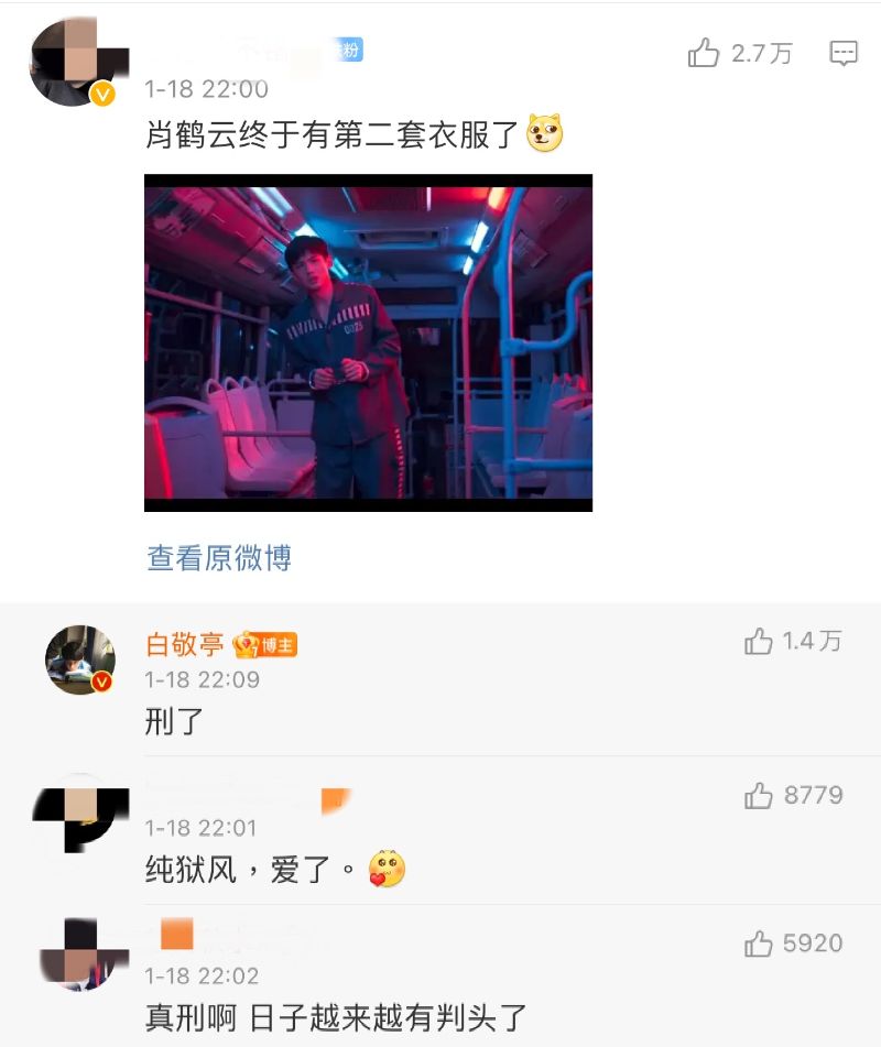 還有人歡呼:「肖鶴雲終於有第二套衣服了!」被小白回復:「刑了!」這玩諧音梗,真的沒人比得過敬亭啊!