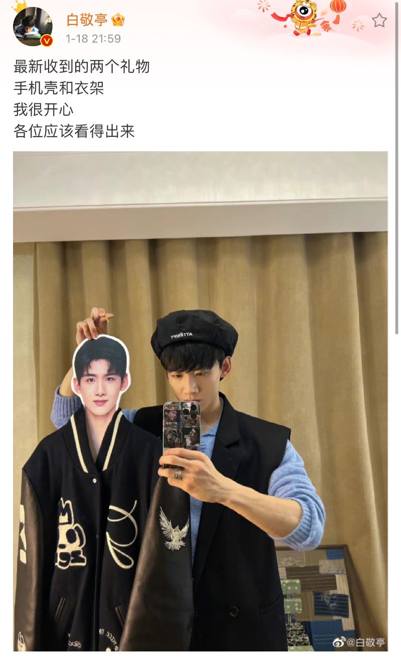 嗚哇~這是舞到正主面前去了嗎???表示最近以懸疑劇《開端》引起高關注的白敬亭,更新了自己的社交網站,配文:「最新收到的兩個禮物,手機殼和衣架,我很開心,各位應該看得出來。」