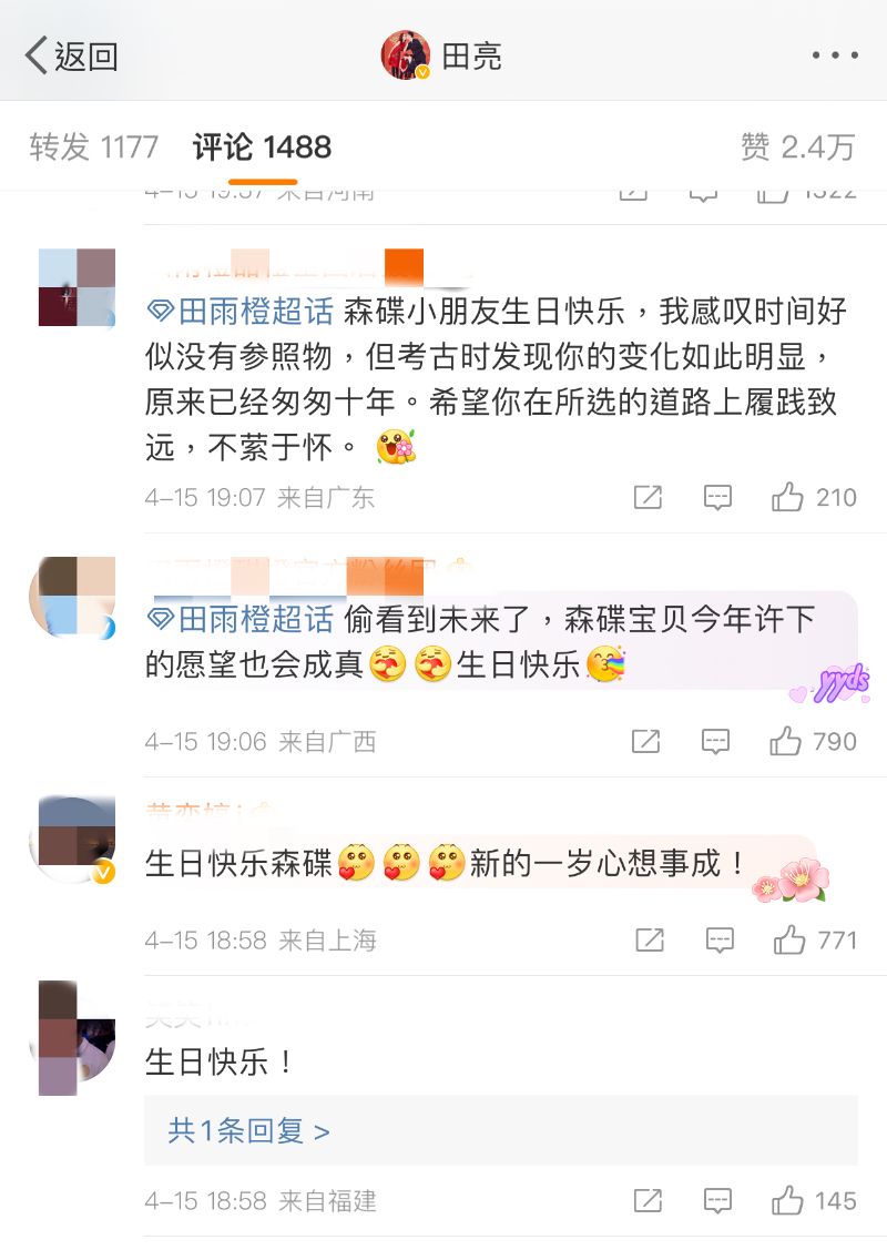 而在田亮評論區,都是祝福森碟生日快樂的留言👇