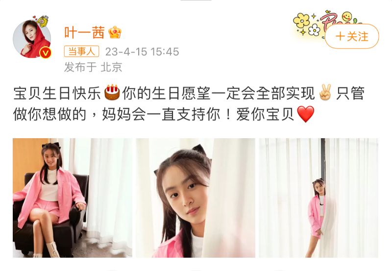 媽媽葉一茜也公開了森碟最新照片,祝福女兒生日快樂,表示:「只管做你想做的,媽媽會一直支持你!愛你寶貝❤️」