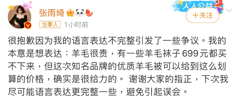 張雨綺回應全文:「很抱歉因為我的語言表達不完整引發了一些爭議。 我的本意是想表達:羊毛很貴,有一些羊毛襪子699元都買不下來,但這次知名品牌的優質羊毛被可以給到這麼划算的價格,確實是很給力的。 謝謝大家的指正,下次我盡可能語言表達更完整一些,避免引起誤會。」