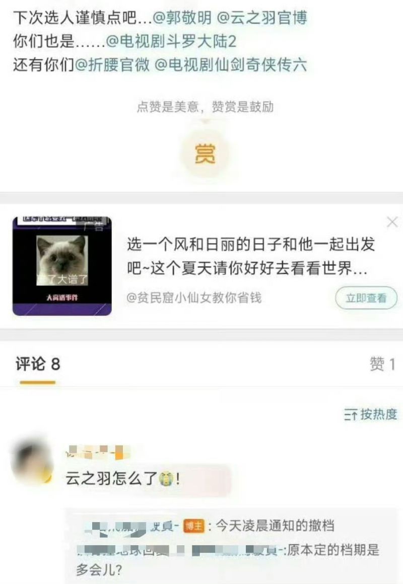 結果沒想到,真的是計劃趕不上變化,沒想到空降不成,分分鐘還要無限期往後延!到底怎麼一回事呢?先來看看,有網友發文爆料,表示希望劇組以後好好選人,直接艾特了《雲之羽》、《斗羅大陸2》、《折腰》和《仙劍奇俠傳六》的官博們,更在評論區回應,表示原本要定檔的《雲之羽》,被推遲了~