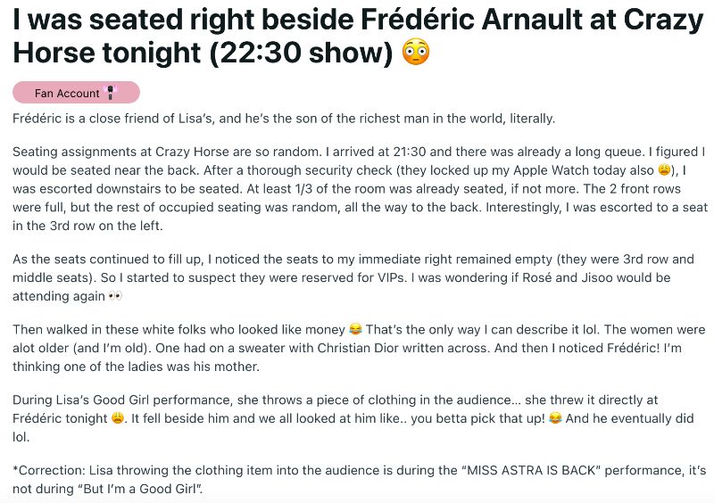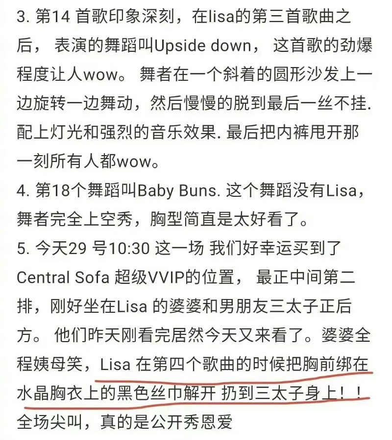 不僅外國觀眾有repo,也有中國觀眾也發文認證,表示LISA將胸前綁在水晶胸衣上的黑色絲巾,扔到了三公子身上,引起全場尖叫,被指是公然秀恩愛~