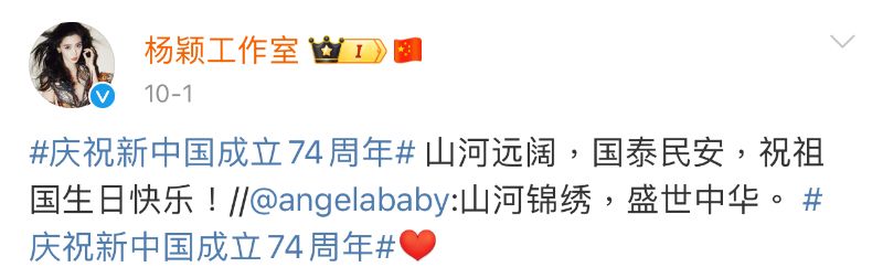 唯獨楊穎工作室的微博,依然停留在國慶當天的轉發文,可以說,工作室已經自瘋馬秀爭議之後,無更新動態👇