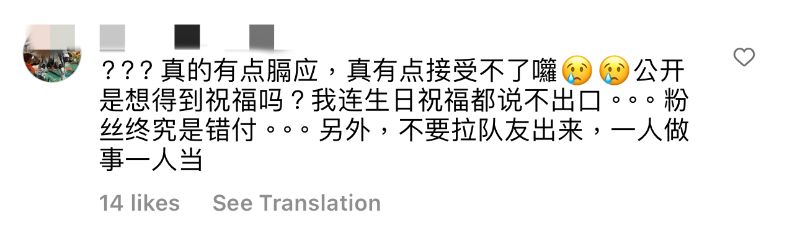 而這次高調曬合照,不少中國粉絲留言表示崩潰👇