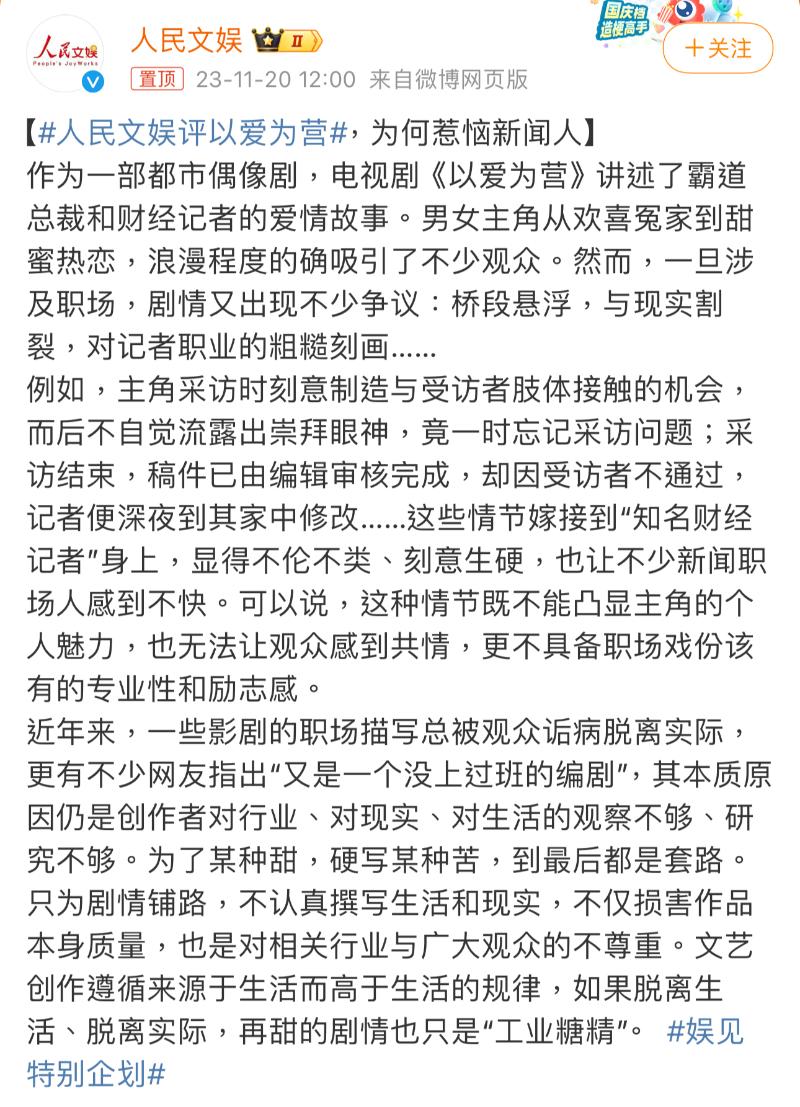 沒想到,20號中午《以愛為營》再次衝上熱搜第一,這次是因為官媒發聲啦!是噠,人民文娛在20號中午發文,點評《以愛為營》與現實割裂,對記者職業粗糙刻畫,脫離生活、脫離實際👇