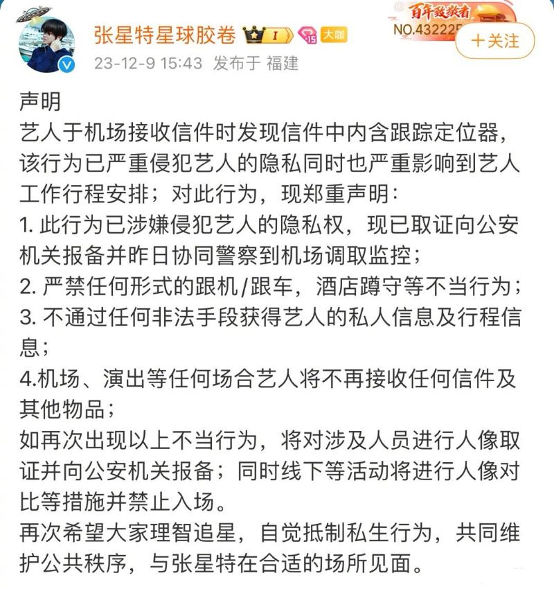 隨後工作室也發聲明,表示在信件中發現跟蹤定位器,所以接下來將不再接收信件,並呼籲抵制私生行為👇