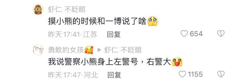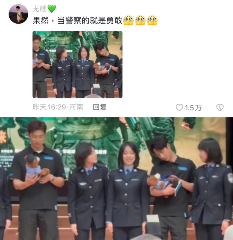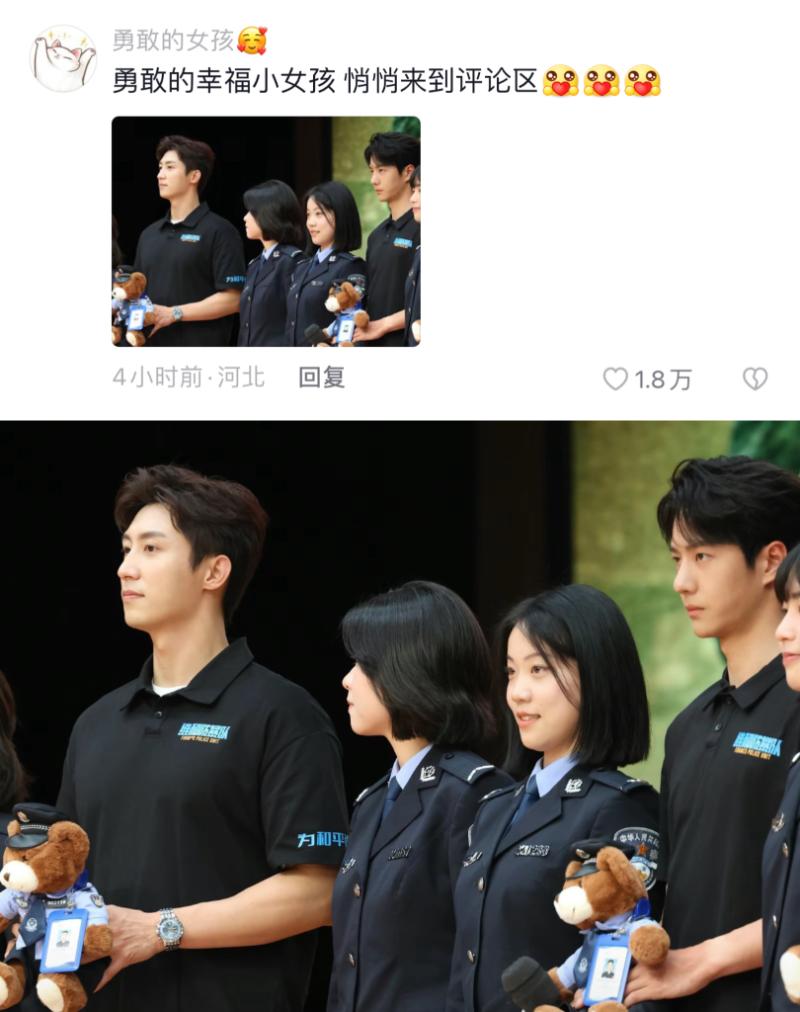 不僅合照,警花們還和拿著紀念小熊的王一博交流起來👇