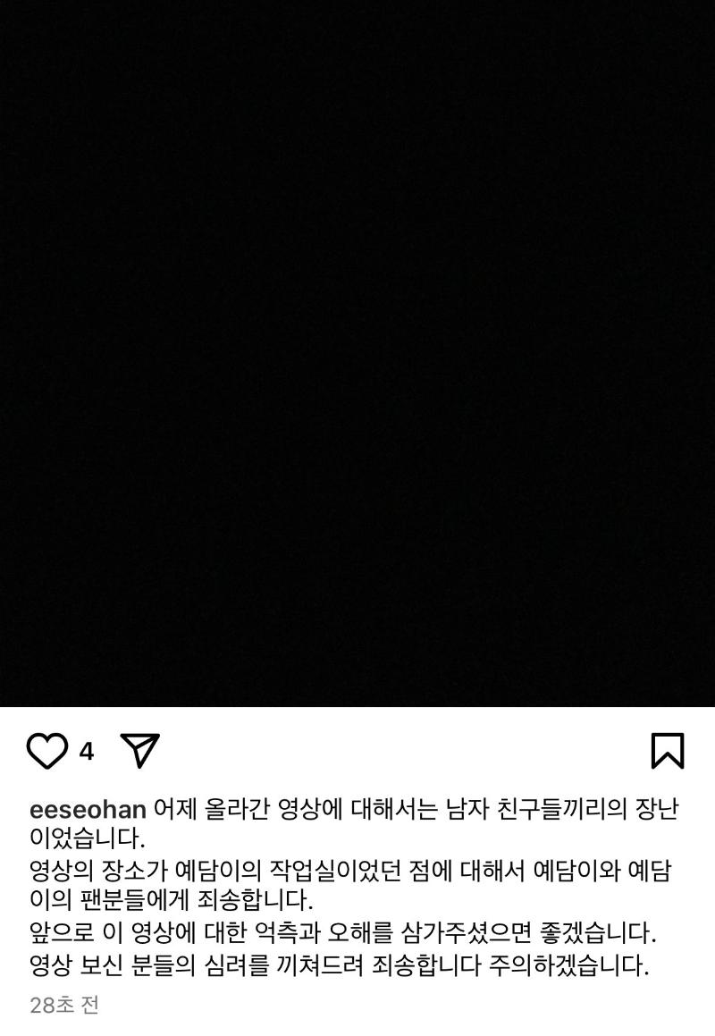 「因為害怕和抱歉而惜字如金,我的解釋反而引發了爭議,所以鼓起勇氣再次上傳了文章。平時關係很好的朋友們經常在藝潭的工作室聽音樂,邊看電影邊喝酒。昨天五個人聚在一起喝酒,12點多,一個喝醉的朋友和藝潭回家了。我和剩下的朋友們在再喝一杯的過程中,將最近經常上演的情景視頻上傳到非公開賬號上。不是非法拍攝物之類的。