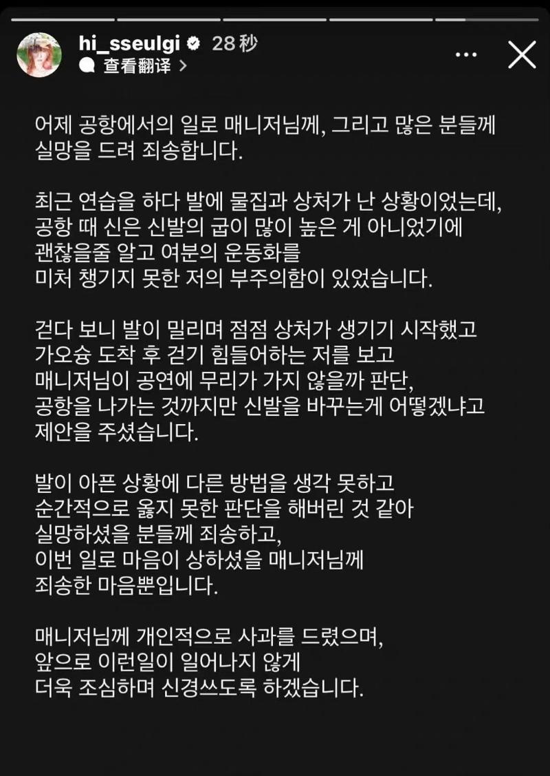 隨著熱議,瑟琪通過INS的限動發佈了道歉信,還原了事情的經過,提到由於腳上出現了傷口和水泡,因此經紀人建議在走出機場時交換鞋子,對自己做出不正確的決定,向所有人道歉。全文如下: