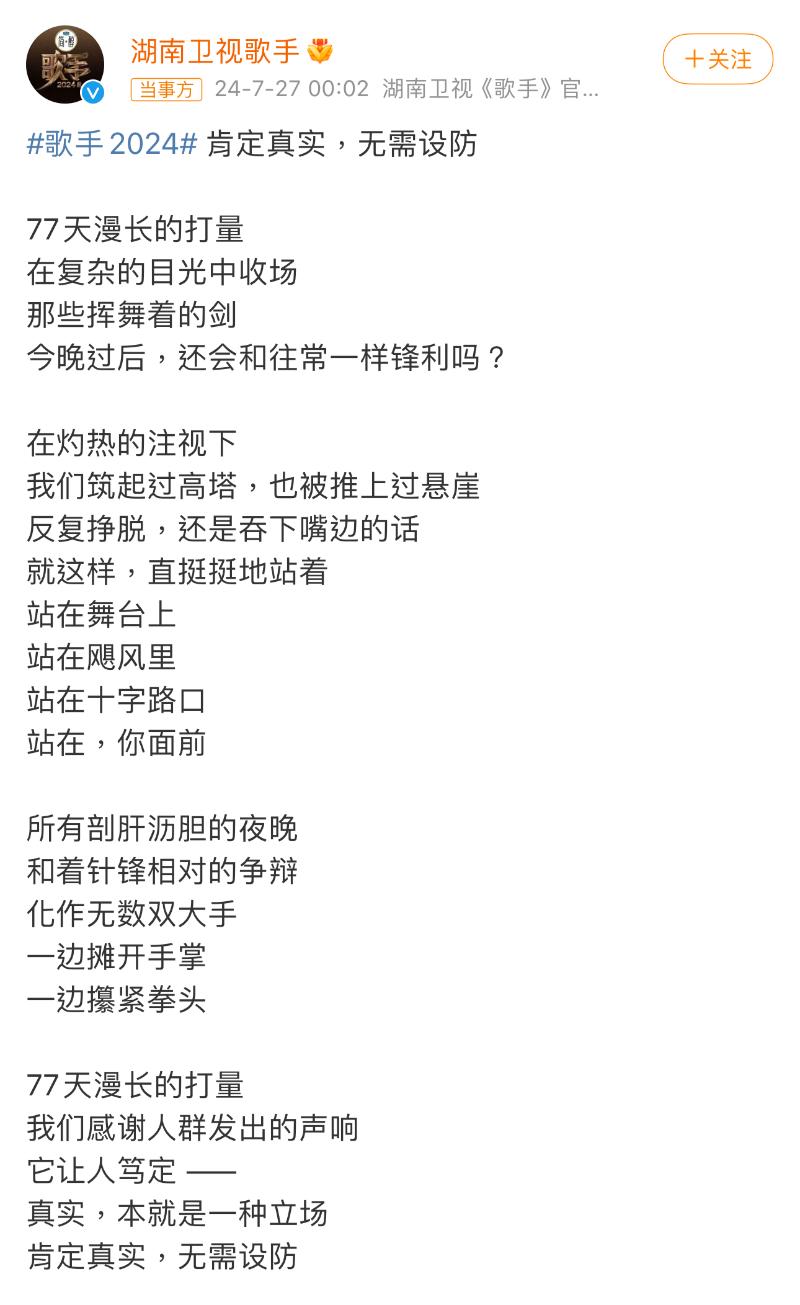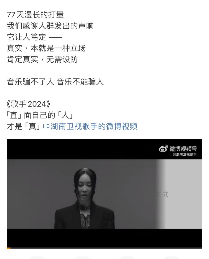 面對爭議,《歌手2024》官方深夜發文回應,強調:「肯定真實,無需設防,音乐骗不了人,音乐不能骗人。」