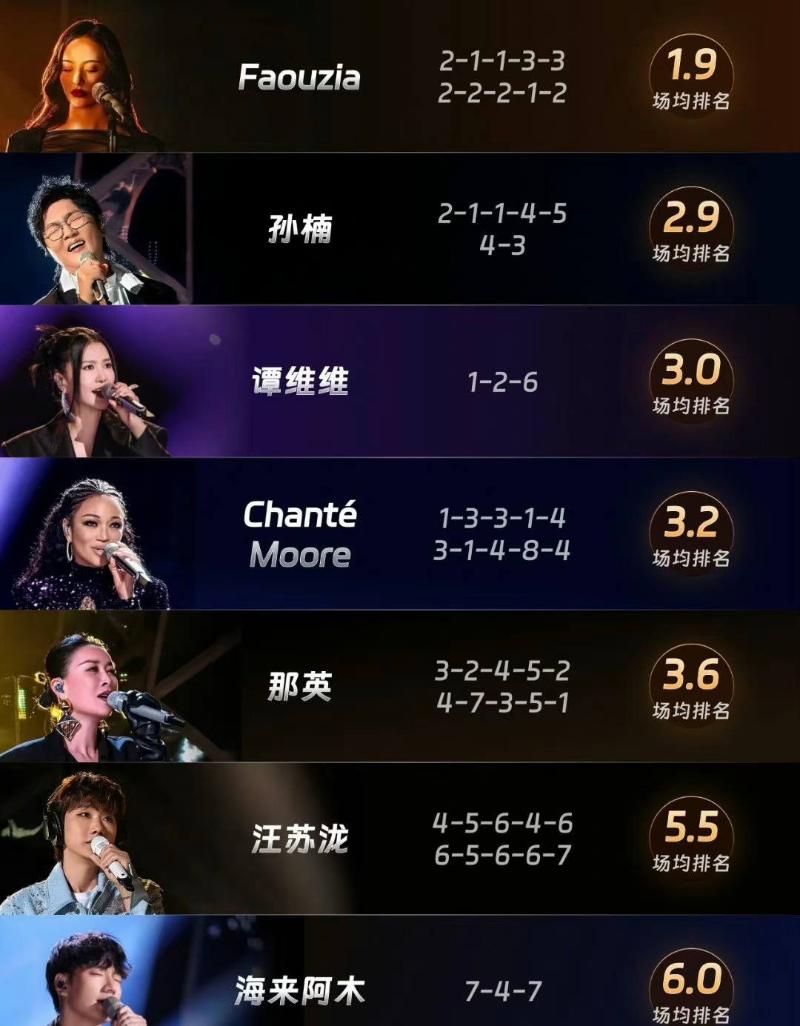 從平均排名來看的話,可以看見排名最好的依然是凡希亞,場均排名1.9!而那英排在第五名!