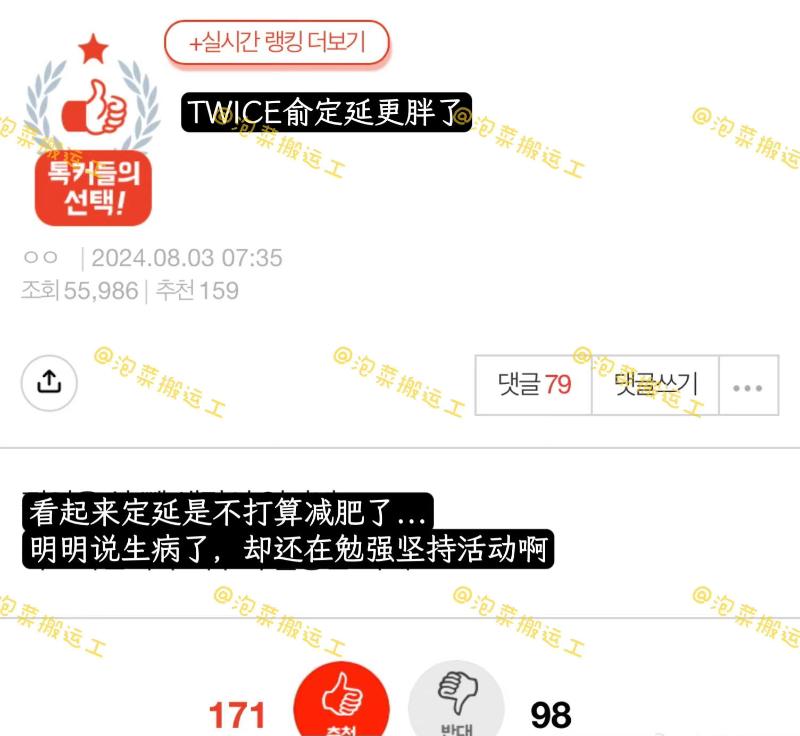 沒想到卻有韓網友發帖,以「TWICE俞定延更胖了」為標題,表示:「看起來定延時不打算減肥了…明明說生病了,卻還在勉強堅持活動啊!」