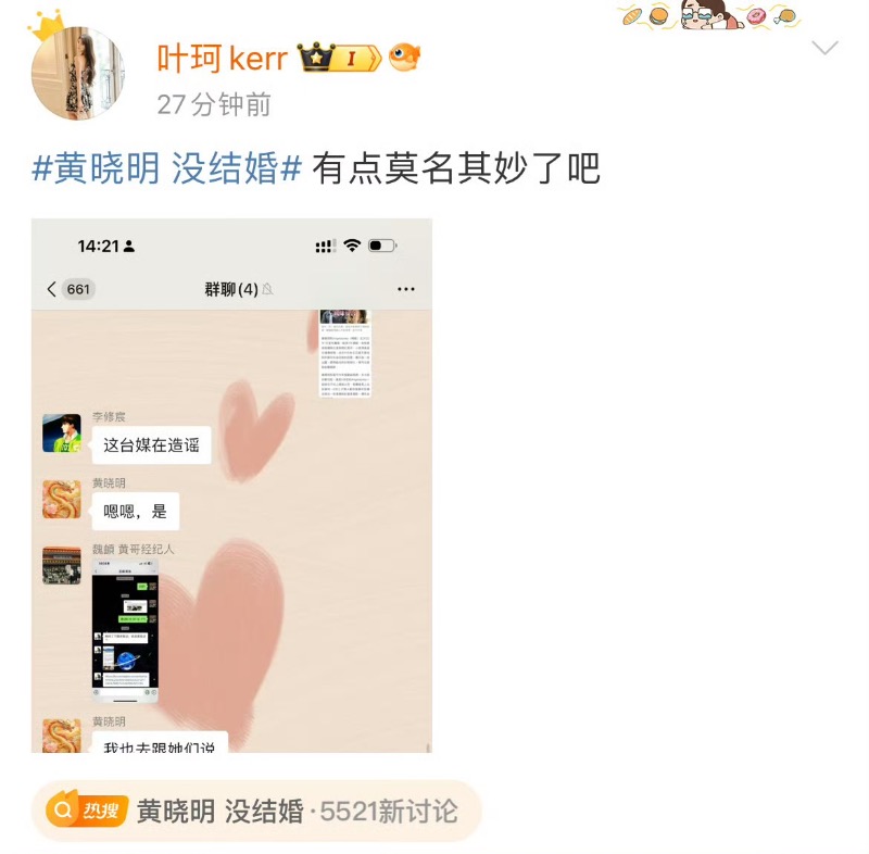 加上黃曉明官宣後,葉珂還曬了聊天截圖,被指是在“逼”黃曉明官宣👇