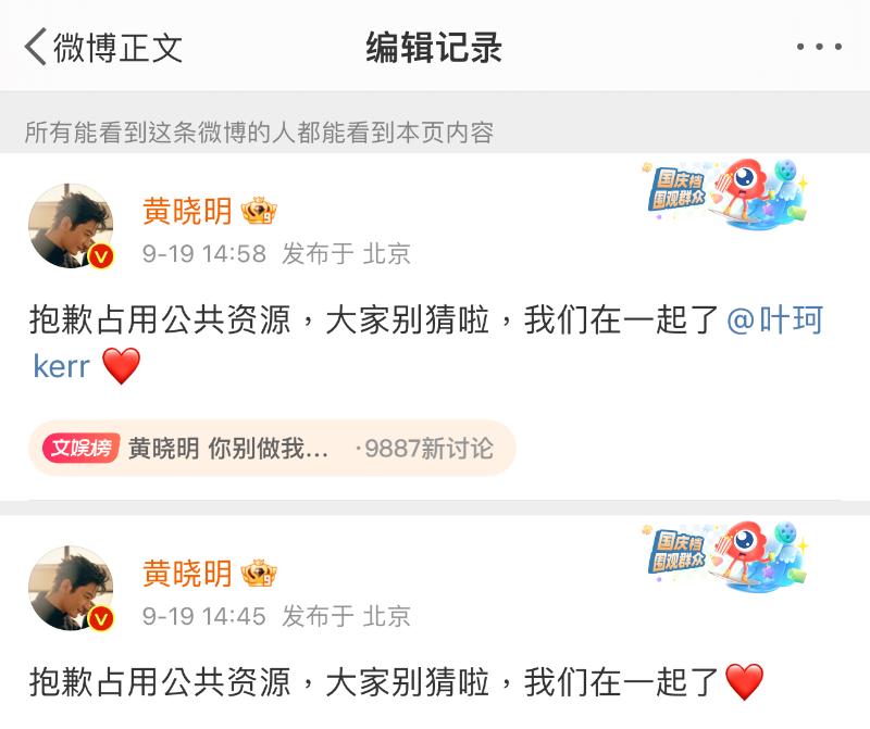 不過黃曉明的官宣詞也有點玩文字遊戲,只說兩人在一起了,但沒提到是不是已婚,甚至一開始沒有艾特女方,被網友取笑👇