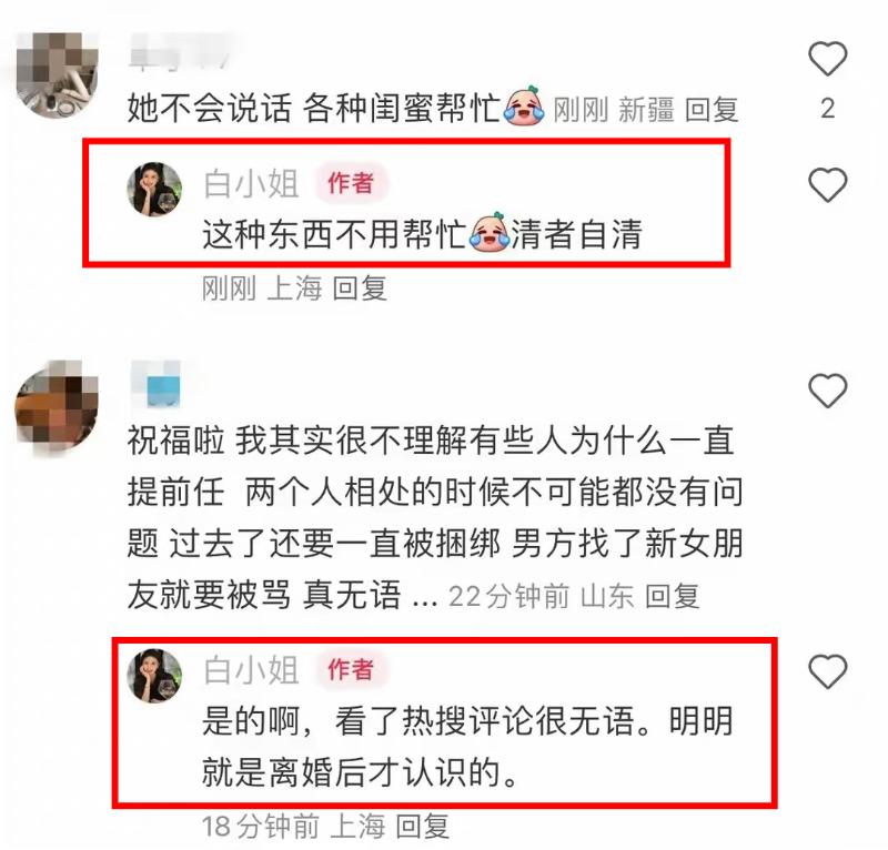 有網友辣評:「她不會說話,各種閨蜜幫忙」被回懟「清者自清」,並表示兩人是黃曉明離婚後才認識的~