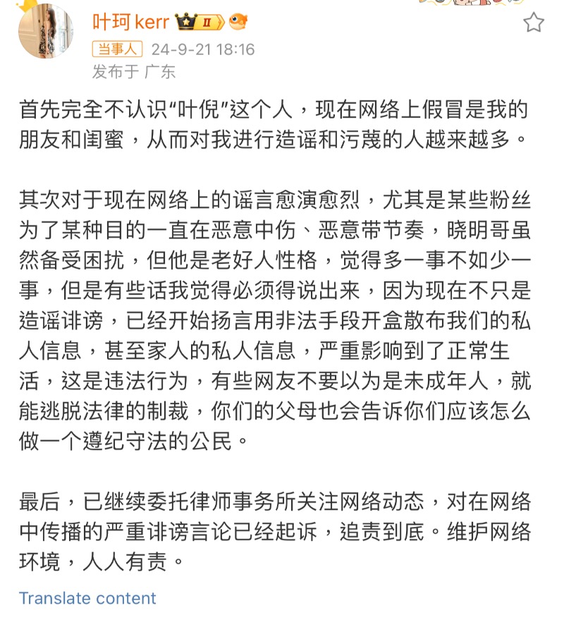 隨著熱議,葉珂發長文回應,表示不認識這位葉倪,順便打假了許多的傳聞,當中包括了「原生臉」及婚內出軌!值得一提的是,她特別提到某些粉絲為了某種目的一直在惡意散播謠言,被指說的是楊穎粉絲,全文如下👇