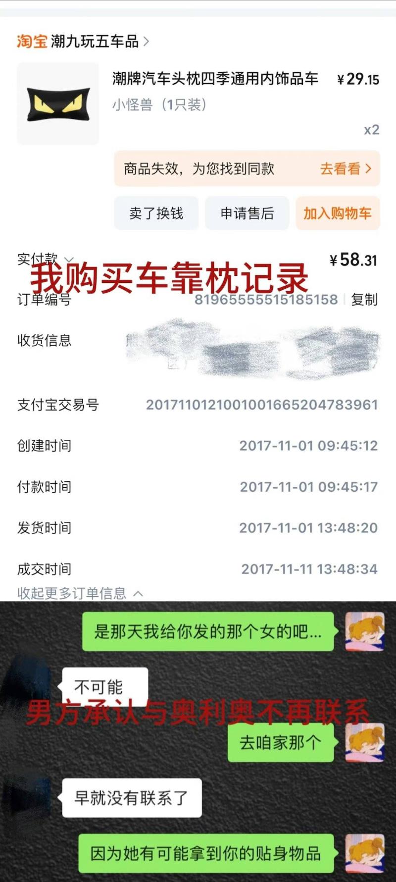 並自曝與男方的聊天記錄,中途,男方開我的車(卡宴)帶該女子出行,我購買的車靠枕照片與當時該女子自曝的車內照片為同一個靠枕。