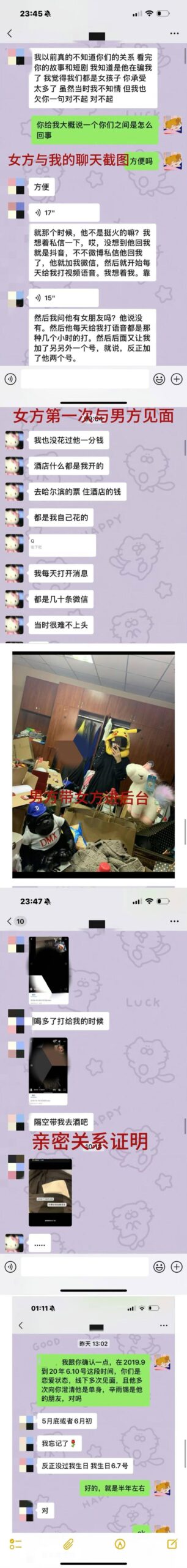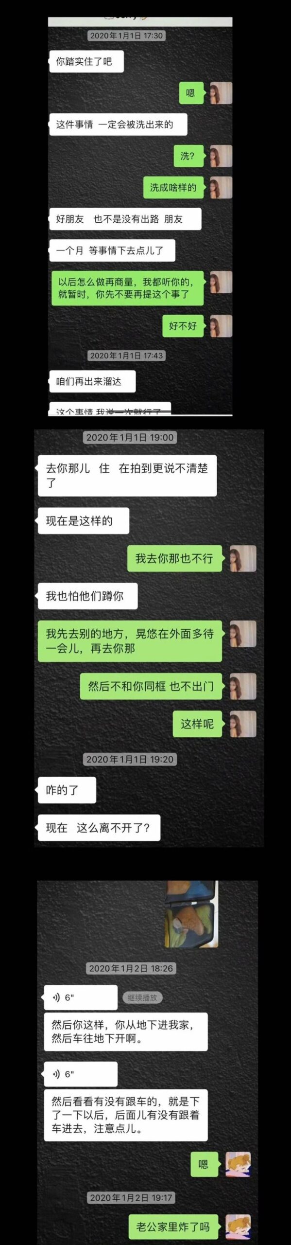 2019年10月,男方在哈爾濱演出期間, 在微博回複粉絲私信,私聯後約至哈爾濱見面,此時我在山東淄博拍戲,還未殺青,二人發生關系,並以戀愛狀態相處,以下為女方為我提供的證據,二人相處時間為2019.10月——2020.5月底,此期間我與男方也仍在戀愛。(圖三)
