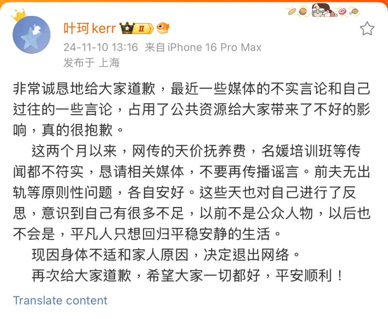 另外,葉珂也在文中回應系列傳聞,包括“天價撫養費,名媛培訓班等傳聞都不符實”,“前夫無出軌等原則性問題。”最後,葉珂提到因身體不適和家人原因,決定退出網絡。全文如下👇