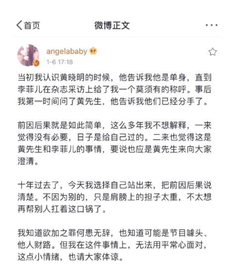 這也不得不說,對比起葉珂什麼都往外提,楊穎真的算是體面人,由始至終都沒提過黃曉明任何話,唯一一次發文,只是為了澄清自己不是「小三」,最後還用了「這點小情緒,也請大家體諒。」真的…很體面了~
