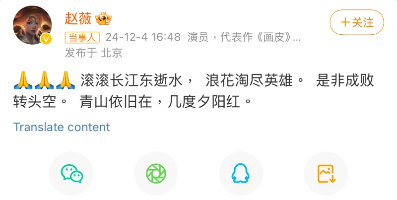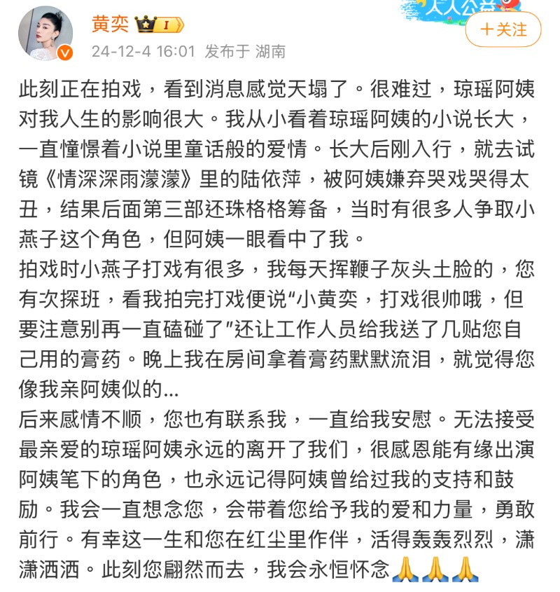 為了悼念瓊瑤,趙薇時隔三年更新微博,足以看得出瓊瑤阿姨在其心中地位👇