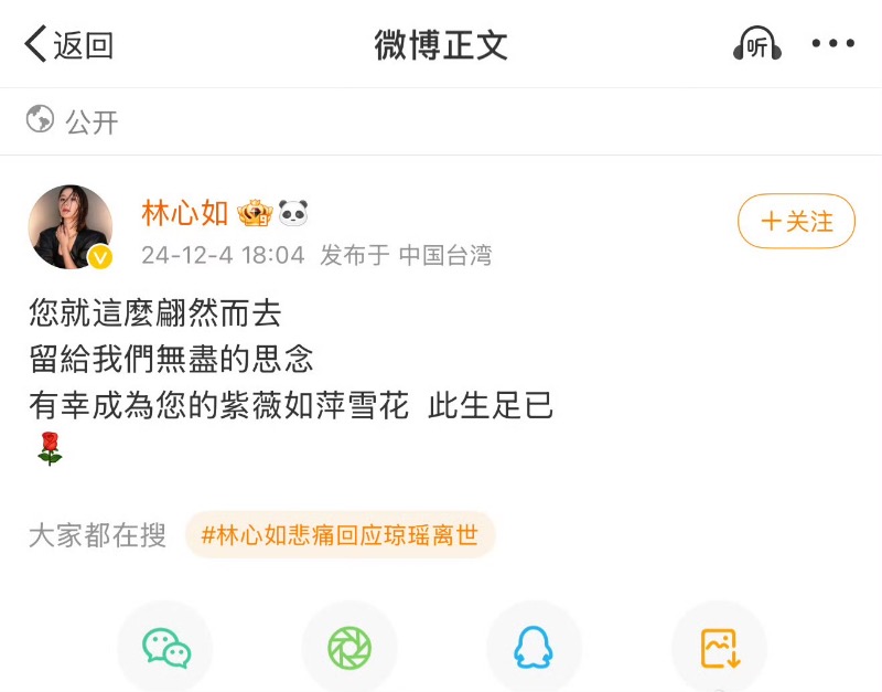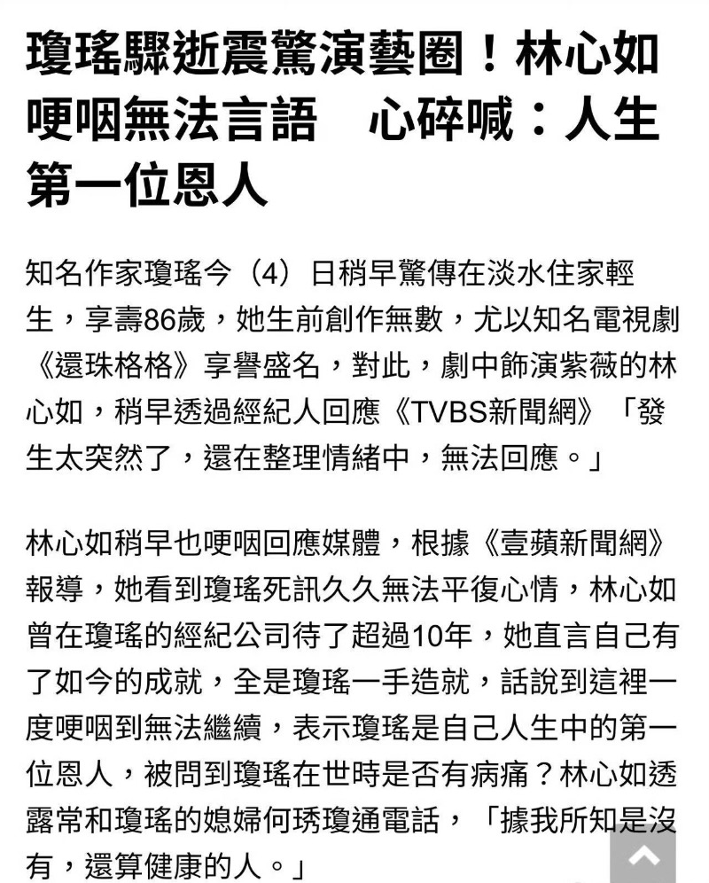 瓊瑤這輩子寫了不少小說,當中多部改編成電視劇爆紅,尤其是《還珠格格》系列,更是陪伴了不少電視迷長大!瓊瑤去世消息傳出之後,台媒第一時間訪問了曾在《還珠格格》中飾演紫薇的林心如👇