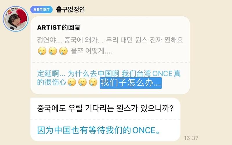 來看看定延回復了什麼?答案是,有粉絲詢問為什麼TWICE要去中國,表示台灣的ONCE(TWICE粉絲名稱)很傷心,並反問子瑜該怎麼辦?而定延就回復,表示:「因為中國也有等待我們的ONCE」
