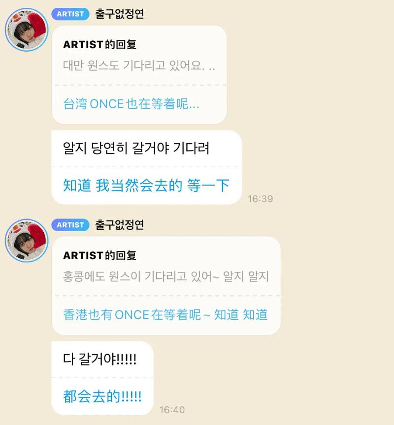同樣來自台灣的粉絲回應:「台灣ONCE也在等著呢…」定延表示:「知道,我當然會去的,等一下」。同時,香港的ONCE也回復,表示:「香港也有ONCE在等著呢,知道知道」定延表示「都會去的!!!!!」