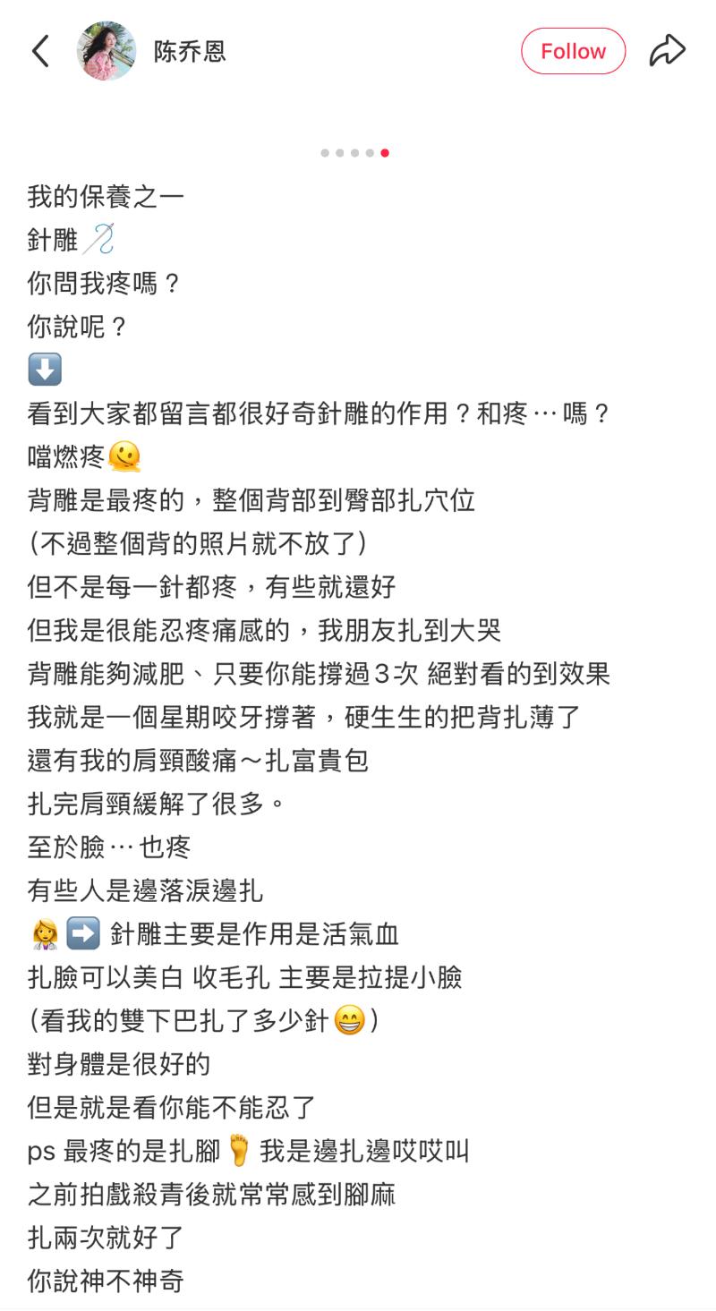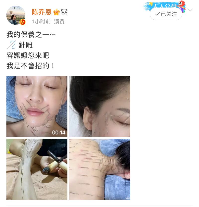 之前陳喬恩不時在社交平台分享自己保養心得,這次她又帶著讓人大開眼界的保養撇步來了,那就是…「針雕」!