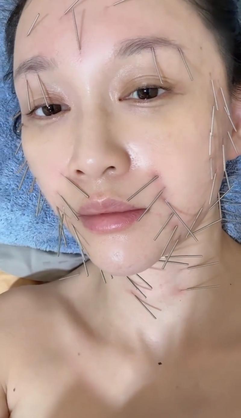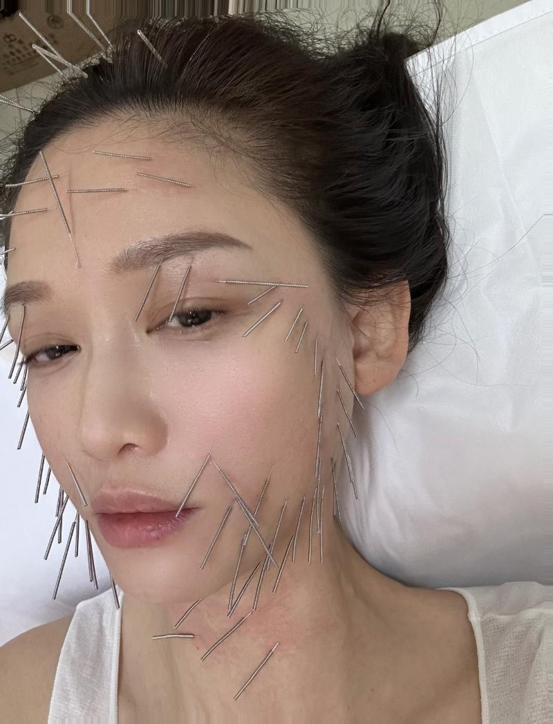 陳喬恩滿臉紮針還可以自拍,直言:「我的保養之一,針雕紮臉可以美白收縮毛孔,但能不能忍痛是關鍵。」