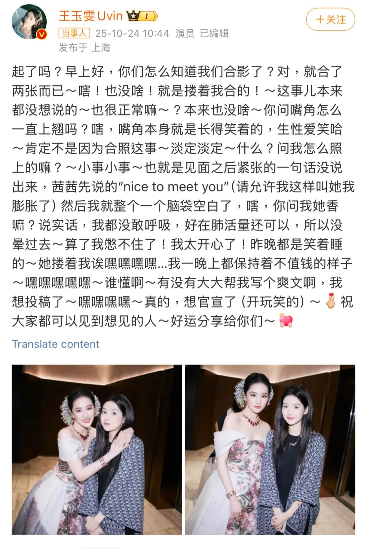 事情的起因,是王玉雯參加了VOGUE時裝盛典,結果居然成功和自己的女神劉亦菲合照,讓她忍不住凡爾賽式的發帖炫耀!
